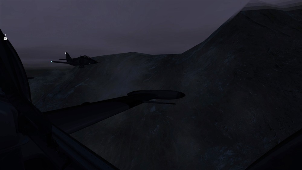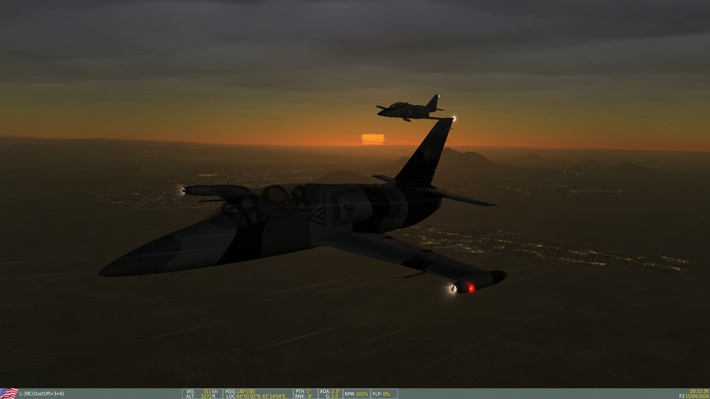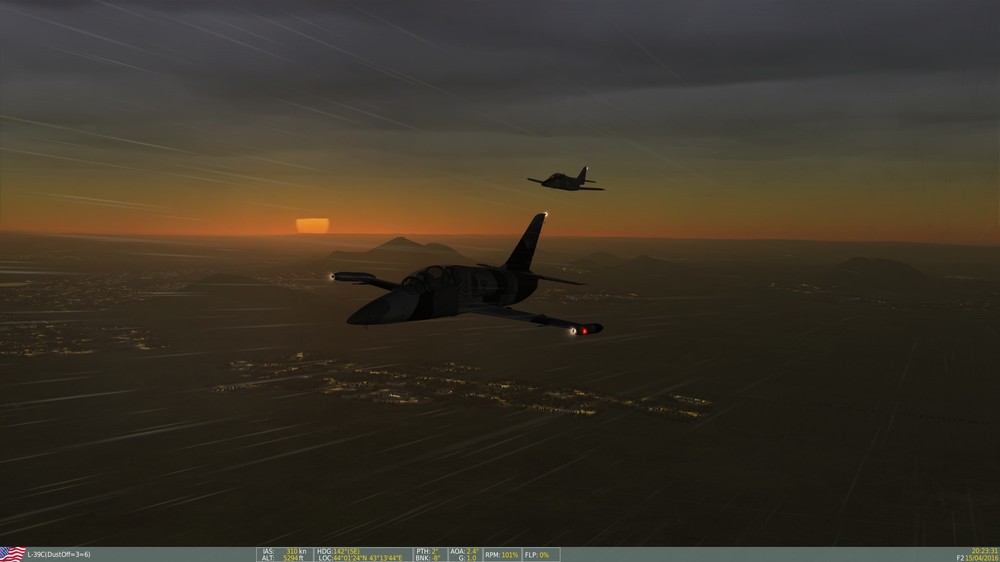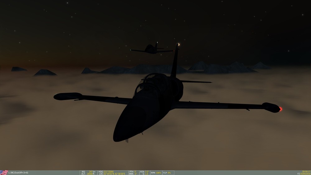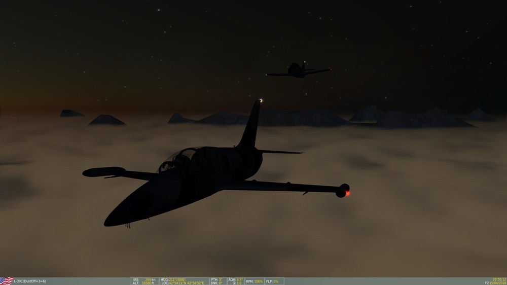 Well today was our first attempt at the world record cross country, I would say it was semi-successful as we ran out of time to make it all the way to our last stop, but we were able to successfully land at kutasi. Journey started out a little rocky. C101 tried to land at krasnodar with no gear and the Hawk forgot to flare. So right off the bat we were delayed about 45 minmutes which is what prohibited us to finish all the way to batumi. However once we took off from Krasnodar on the way to Maykop things started to smooth out. The 3 ship was separated due to pilot error and the stranded Hawk ended up getting R27ERd to the face after becoming hypoxic and blacking out at 17,000'. Now we are down to a flight of 2, C101 and L39. Our next segment had us departing Maykop eastbound to Nalchik via Mineralyne VOR. However over the course of 140NM several surprises came upon us. Moderate ice was encountered and forced our 2 ship to climb rapidly at full military power. In the frantic climb the C101 forgot to switch fuel tanks and lost engine power. An airborne restart was attempted then failed due to fuel pump positioning. (pilot error) However the second re-light attempt was successful thanks to flight lead guiding the scared trainee through the procedures. Once the Engine was recovered the pitot static system iced over on the C101 and forced him into a dive to get out of the icing and find warmer temperatures. He eventually found his anti-ice switch and turned it on....:doh: Rejoined with about 50NM to way point Nalchik beautiful screen shots were taken during the sunset flight and approach. We tuned in the ILS and did practice ILS landing. The next segment of flight had us crossing very rough high altitude terrain and dark was fast approaching. Hot refueling procedures at Nalchick and the 2 ship was off to brave the mountains. ***meanwhile mr hawk pilot has been on an intercept heading full military power to intercept our position*** We began flying up a small mountain valley below the cloud layer. Rapidly realizing the mountains are becoming obscured by low level clouds we begin a max power climb. Completely in instrument meteorological conditions and in high terrain at night...bad situation. Luckly the C101 broke through the top of the layer and frantically told flight lead to climb as fast as possible. Struggling to maintain airspeed as is I pitched up to brink of stall. Eclipsing the cloud layer I noticed we were heading straight for the tallest peak!:surrender: Clearing the side of the mountain by less than 50' crisis was averted and we re joined tight formation to capture a few more shots of the terrain above the clouds. *at this point the hawk is only 5 miles to intercept us! he pulls up to clear terrain, blacked out, stalled and ended up a smoking hole in the mountains north of Kutasi..RIP Cravgar:worthy: Server running short on time we max power fly to Kutasi and land successfully, however still about 60NM short of our original intended destination of Batumi...maybe next time.:pilotfly: For just a flight with no weapons it was still action packed and we were all exhausted after nearly 2+ hours of constant flight, refueling, instrument navigation, and system failures. Maybe next time we will leave a bit earlier:thumbup: