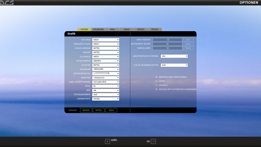 Hi Franky Der Pc war ein anderen meiner hat folgenden Daten. I7 4820k @ 4Ghz LGA 2011 Asus Rampage IV extreme 1600er 8 Gb Gskill Gtx 1080 und die ne 240Gb SSD auf dem DCS läuft. Win7 aber upgedatet zu Windows 10 64Bit Wenn ich mal gleich zuhause bin poste ich mal die Einstellungen.