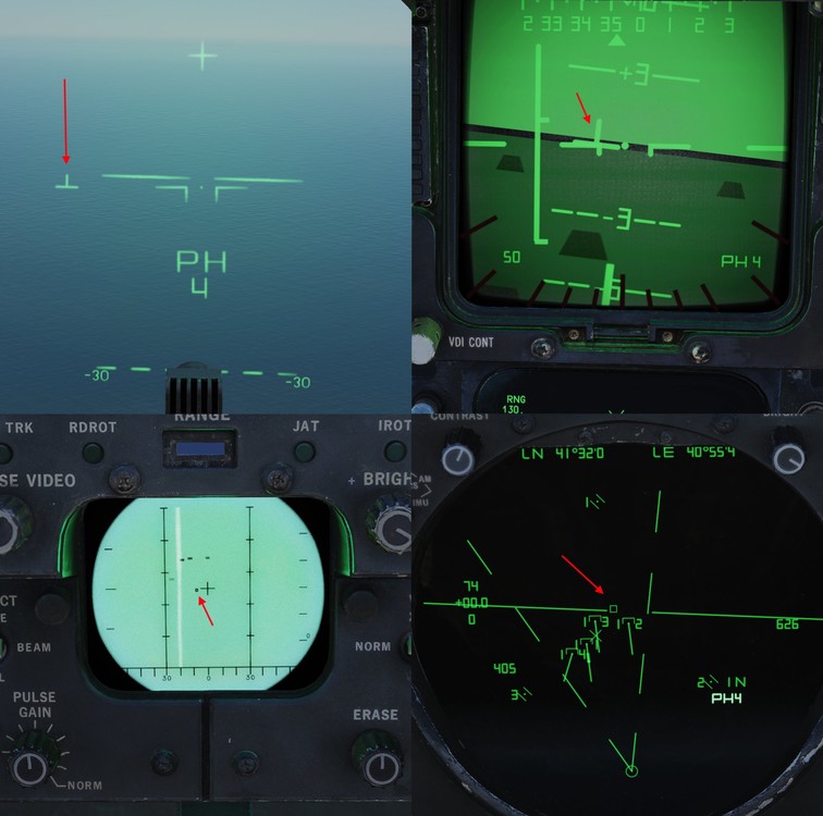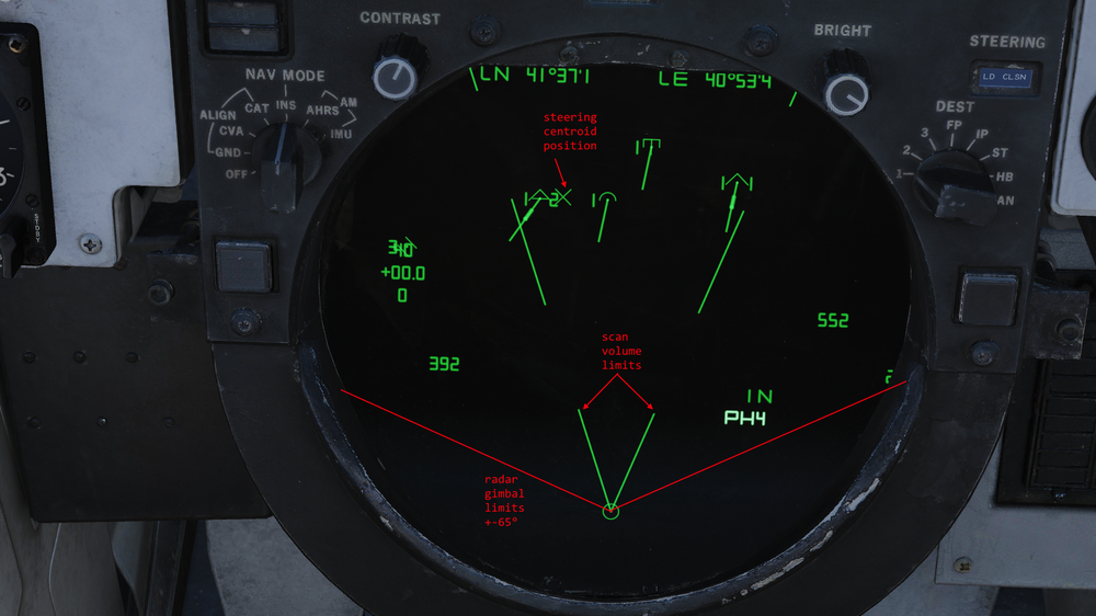 Track While Scan - Auto As most know, we had a TWS-Auto implementation for the F-14 at launch, but it was quite unreliable and ended up causing more trouble than it was worth, so it was disabled. After launch of course we were kept quite busy, and it was some time before we managed to revisit and eventually rewrite the TWS-Auto system. We’re finally ready to re-release it now, and this post will summarize the functionality. As you may remember, both TWS modes require the scan frame to be 2 seconds, and only support 2-bar ±40° or 4-bar ±20° scan volume modes (the radar gimbal moves at 80°/s, so you can see where the 2 second frame comes from in these two scan volume options). Very simply put, TWS-Auto attempts to keep the TWS pattern pointing where it is most useful in azimuth and elevation, while also controlling the optimum scan volume. TWS (and all the PD radar modes in F-14) uses ground stabilized (a.k.a. Earth fixed) patterns, so the azimuth and elevation angles are relative to a tangential plane on the surface of the earth at your present position, with azimuth further being relative to the F-14 longitudinal axis too (i.e. 0° is directly ahead on the imaginary plane, -20° is to the left, etc.). Function of centroid The azimuth and elevation angles are determined by a weighted centroid of targets in the scan volume. What this means is that some targets contribute more to the centroid than others, depending on a few factors outlined below. Essentially the position of each target is multiplied by its weight factor divided by the total weight of all targets, and these weighted positions are added together to give a centroid. Only sensor targets (i.e. own radar) are considered, not datalink targets. Two separate (but somewhat related) centroids are calculated as part of the TWS-Auto update procedure: a steering centroid, and an illumination centroid. The former facilitates steering cues (on HUD, VDI, TID, DDD) to help the pilot maintain optimum target coverage, and also displays a small X on the TID indicating the steering centroid position. The illumination centroid controls the azimuth and elevation of the scan pattern center by using the angles from the aircraft to the computed illumination centroid (in TWS-Manual, these are directly controlled by the radar azimuth and elevation knobs on the RIO sensor control panel). The velocities (change in position over time) of both centroids are also calculated, used to calculate steering, and dead reckoning for a short period when all targets are lost (in an attempt to re-acquire them at their expected positions). Weighting targets As mentioned, a few factors influence target weighting. These differ slightly between the calculations for the steering centroid and the illumination centroid, but largely consist of the presence of a launch zone (targets marked as friendly by RIO will never get a launch zone), whether a missile is already underway to a target, and some RIO selections on targets such as DO NOT ATTK (disregards from weights completely, shows a small vertical bar over a target) and MAND ATTK (forces evaluation and raises importance, only one target may be selected for this, and mutually exclusive with DO NOT ATTK. Shows a small horizontal bar over a target). Targets that are not displayed on the TID screen in the currently selected TID mode and range are also disregarded completely. In addition, targets which are deemed to be leaving the scannable volume are also raised in importance, if they are already deemed important by the previous criteria. For the steering centroid, the radar gimbal limits (maximum extents, basically ±65° in both azimuth and elevation) are considered, while for the illumination centroid, the current scan volume limits are considered (i.e. either 2-bar ±40° or 4-bar ±20°). This causes the illumination centroid to adjust towards important targets leaving the current pattern, and allows the steering centroid to shift towards targets that are leaving the maximum radar gimbal limits (i.e. pilot would need to steer towards that to keep them illuminated). Engaging TWS-Auto When TWS-Auto is first engaged, there is a period of 8 seconds where the manual controls for azimuth, elevation and the scan volume pattern are still in effect and can still be controlled by the RIO. After this period, the computer takes over. The scan volume pattern (2-bar vs 4-bar) is re-evaluated every 4 seconds, while the centroids are re-evaluated multiple times per second. The weights are updated at the end of each 2 second scan frame. The scan volume algorithm considers the future positions of all targets, and selects between which of the two options would give a greater total illumination weight. If they are equal, 4-bar ±20° is selected. Firing an AIM-54 Phoenix while in TWS-Manual will result in automatic selection of TWS-Auto. Furthermore, when any AIM-54 missiles are deemed to still be in flight (up to 16s beyond their expected time to impact), TWS-Manual cannot be entered (the button press is ignored). Target tracks that have a missile launched at them will also behave as if Track Hold (the button to the left of the TID fishbowl) has been selected, i.e. they will continue to be extrapolated for up to 2 minutes if their radar contact is lost. Symbology The steering cues on HUD, VDI, TID and DDD will direct the pilot horizontally only, based on the steering centroid. By default, lead collision steering is employed. If the RIO uses the CLSN button next to the TID fishbowl, pure collision steering is instead calculated. Since both the pilot and RIO can see steering cues on their respective displays, coordination of required maneuvering is made easier. The steering cue on HUD and VDI is an upside-down T (hence called a steering tee), while on the TID and DDD the steering cue is a small square. These four displays have different steering sensitivities: TID is 40°/inch, DDD is 128.5°/inch, VDI is 25°/inch and HUD is 26.5°/i