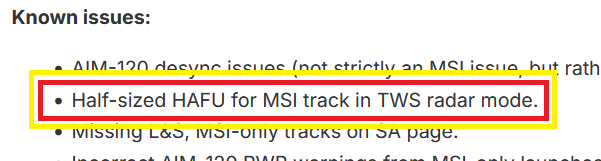 Right now, the Hornet's radar is in a bad way for any significant air to air employment. In addition to this OP, you can no longer step through TWS priority tracks either. All-reported, but probably serious enough that it should've warranted a no-release for this MSI improvement...or a quick hot fix. They'll get to it. -