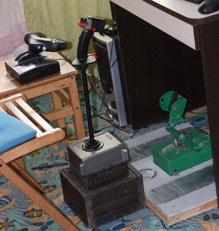 Именно так длину ручки и подбирал, локоть у меня опирается на бедро. Просто на фотографии где ручка рппу в разных положениях на фоне виртуальной ручки я джойстик поставил на стул, чтобы было видно на фоне экрана ) На первой фотографии видно, что сама ручка не сильно выше сиденья стула. Существенное же отличие, видимо от настоящего, это слишком большой ход, и при крайних положениях при кренах сама палка упирается в ногу. Но это не сильно мешает, т.к. такие крены бывают не часто ) Раз уж разговор пошел про ручку РППУ, можно задать вопрос, который меня давно волнует, для чего на реальных вертолетах палка гнутая? И еще один вопрос, если позволите, что это за лючок с рычагом открыто/закрыто на полу перед педалями?