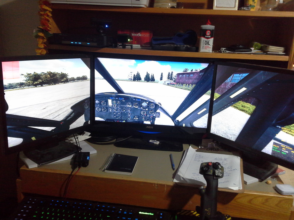 Pics ebabil, here are some pics. Sorry about the somewhat bad quality but hope this helps side note: middle monitor is an Aveis, you probably will never find this brand but if you do, stay away, it was just really cheap for me at the time. However, the NEC monitors are great. The 41 in the bottom right of the second pic and the 117 in the last is the fps, though it is in a single player setting with no AI at all.