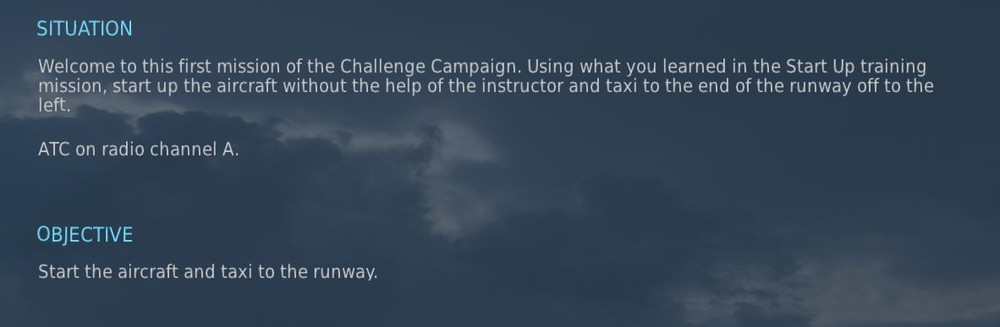 The first mission in the Challenge Campaign is just to get the aircraft started and to the runway. The mission ends there. You can take off and fly around if you wish, but you are on your own. You should have received an audio and visual message that the mission has ended when you get to the runway. (Note: If you turn right and go via the far taxiway near the C-130 you avoid the message trigger zone and won't get the 'end of mission' message.)