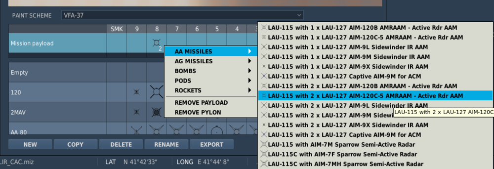 Hello, I wish to have an option to repeat the assignment of a weapon/station content onto another station just by left clicking the box of that station (if last selection is valid). This will reduce the time and effort to load a complete aircraft enormasly. In addition, this will reduce the risk of a wrong/unrealistic assignment, e.g. to have an AIM-120B under the left wing and an AIM-120C under the right wing by mistake... Example: - Normal assignment an "LAU-115 with 2 x LAU-127 AIM-120C5" to station 8 - Afterwards, all stations which can get the same assignment will be visualized ( In this example, they becomes green) - Now you can just left-click the green boxes to simply assign the same selection to that station. - If you hold shift during click, the opposit station will be loaded as well (E.g., clicking station 7 while holding shift, station 3 will be loaded as well with the same content) and/or if you hold ctrl, all green stations will be loaded with that content. Alternatly or additionaly, you can just create some kind of mechanism on the right area which is not used today: Right click in that area => Select a weapon from the menue, but now the meue contains all content which is feasable for that certaint aircraft. When you select a content here, again all stations where you can assign the weapon becomes green. Now the content can be assigned by left-clicking the box of a station. And again, If you hold shift during click, the opposit station will be loaded as well (E.g., clicking station 7 while holding shift, station 3 will be loaded as well) and/or if you hold ctrl, all green stations will be loaded with that content. After selection: -
