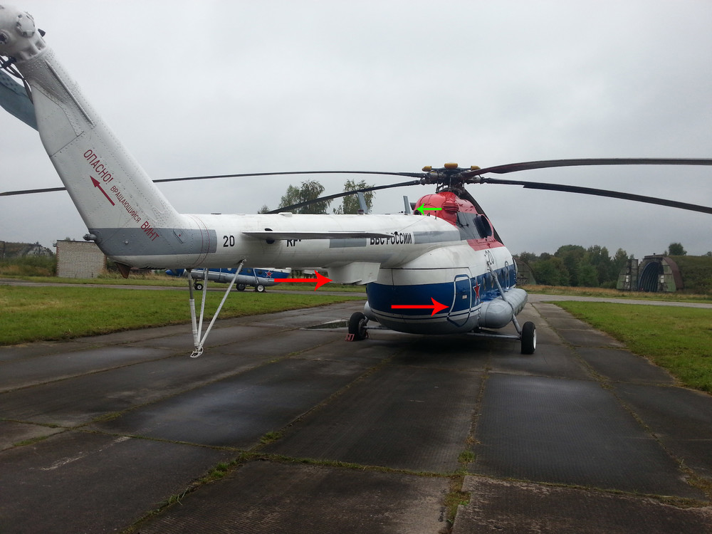 Красными стрелками отметил отличия от МТВ. Подкосы основных стоек без обтекателей, в отличие от модели в dcs. Панели тоже отличаются. Версия нестандартная - скорее МТВ-2, но есть несколько элементов от МТВ-3 - вторая антенна АШВ-75 и антенна ответчика в обтекателе на верхней части кабины. Из интересного - отсутствует ЛИПА и по левому борту вроде широкая сдвижная дверь. Установлены виброгасители. Также интересна конфигурация правого птб и ко-50, она больше характерна для Ми-8Т и вертолетов выпуска Улан-Удэ. В определении очень помогли бы фото кабины и заводской номер.