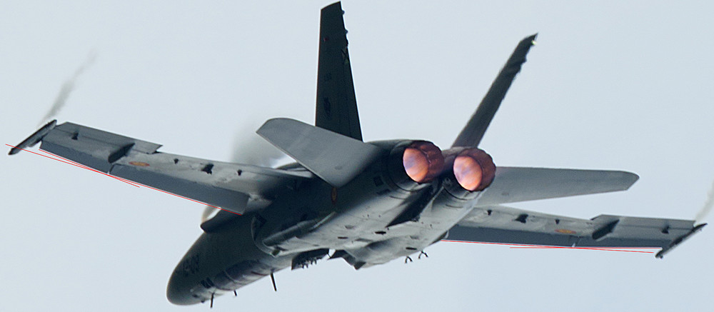 I guess that when you are writing, 'the wing is bended' you mean the geometrical twist or washout. Nevertheless, without load, the leading and trailing edges are simple straight lines. The shape of the F/A-18 wing isn't complex at all. The Concorde has a complex wing shape. That said, looking at various cockpit videos (easier to judge wingflex IMO) the wing does seem to bend in a slightly non-uniform way with a sharper bend at he folding joint. Again, I'm surprised how nice and realistic the DCS version is.