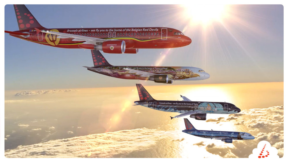 Brussels Airlines Special Livreries https://stuckattheairport.com/tag/brussels-airlines/ Five different aircrafts : Amare (Tomorrowland) Rackham (Tintin) Magritte (Famous Belgian surrealist painter) Trident (Belgian football team - Red Devils) N°1 FIFA Ranking ! Aerosmuf (Smurf)