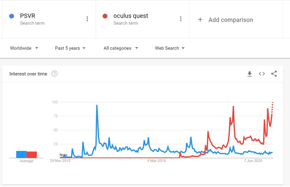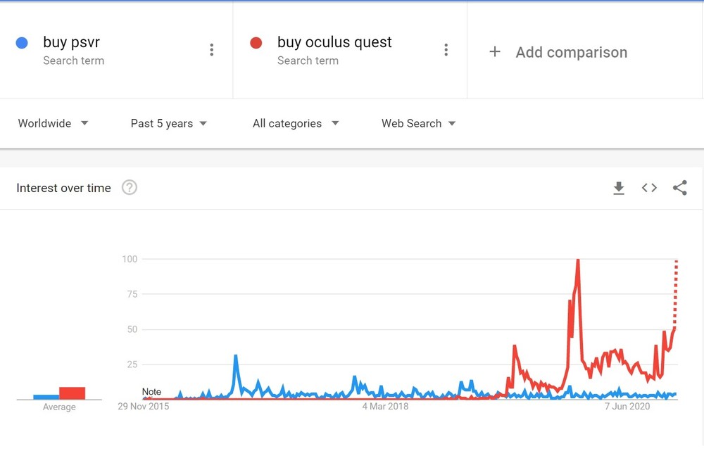 It's funny how all these journalists were saying this for years because they didn't see an immediate explosion of VR. It's almost as if everyone forgot how new technologies improve and are adopted over time. I think this is partly due to iterations on consumer devices like mobile phones, TV's with slightly improved screens or whatever. If you look at the trend, VR has been steadily growing for years and it's at the point now where it's going to really take off. Look at Oculus Quest and how well that is doing. It's getting more interest from people in the past few months than PSVR got in its entire 5-year history and Sony sold around 6 million units in 4 years. Now look at these! I've chose to compare keywords with the phrase "buy" in them because it implies strong intent to purchase. Meaning, Facebook are converting people from simply being interested to actually having their credit card in their hand so to speak. Now consider how long it took for Sony to sell that many units. And how long it'll probably going to take FB. And now look at the steady increase in interest for Quest vs PSVR! I was just watching a video of Jesse Schell talking in July about the sales on Quest vs PCVR. He said that for every 1 copy sold on PC, they're selling 10 on Quest. The future looks bright for VR. :)