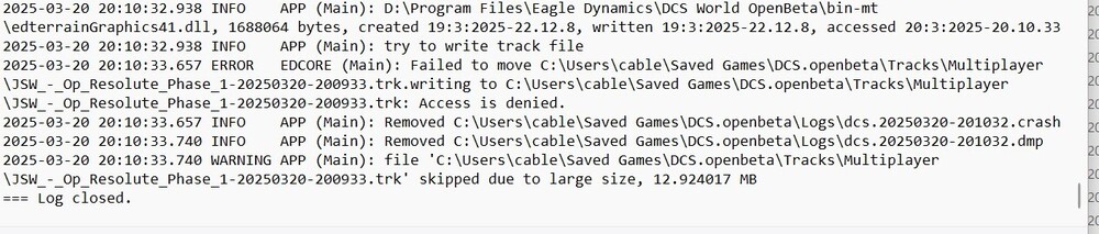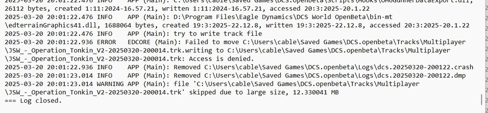 OK, thanks. I looked at the logsdcs.log-20250320-195103.zipdcs.log-20250320-194653.zipdcs.log-20250320-201032.zipdcs.log-20250320-200122.zip and those were the places where I could see a failure. Here are the full logs from the session where the game started crashing.