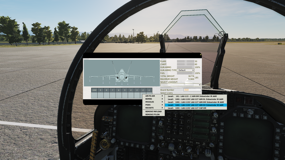 Game version: 2.5.5.40269 1. Add F18 on an Airport 2. Edit airport's AA missile using the Resource Manager. 3. Disable all missiles except 9M by setting their availability to 0. 4. Enter the mission and select the F18 5. Ask ground crew to rearm 6. Note that on position 2 and 8, all Sidewinder varieties are still available under LAU-115© 0000_test_f18_9x_restriction.miz