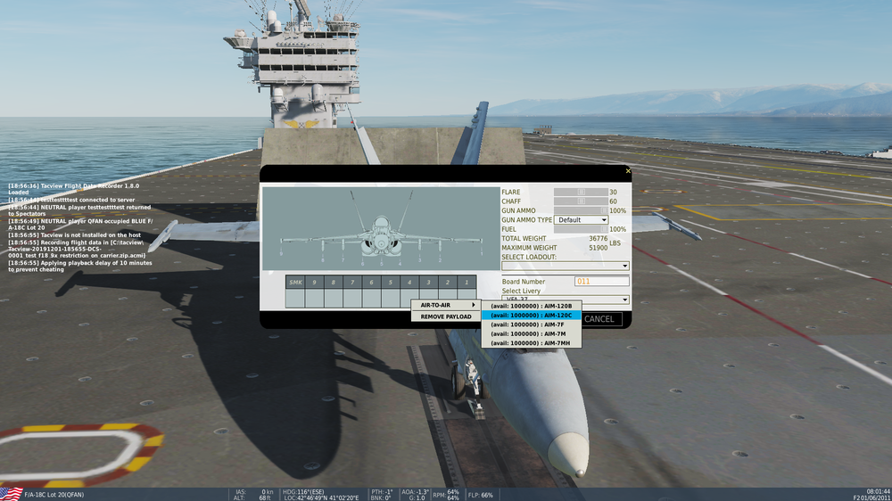 Version: 2.5.5.40269 1. Edit a mission with a carrier, restrict AA missiles to 123 AIM-9M. 2. Put an F18 on this carrier as Client 3. Run this mission on a dedicated DCS server 4. Using a different PC, connect to this server 5. Select this F18 and ask groud crew to rearm. Observe that all AA missiles have 1000000 available. Note: Only reproduceable when connecting to a remote server. If server itself is the player, the restriction is applied correctly (except pylongs 2/8, which is reported separately). 0001_test_f18_9x_restriction_on_carrier.miz