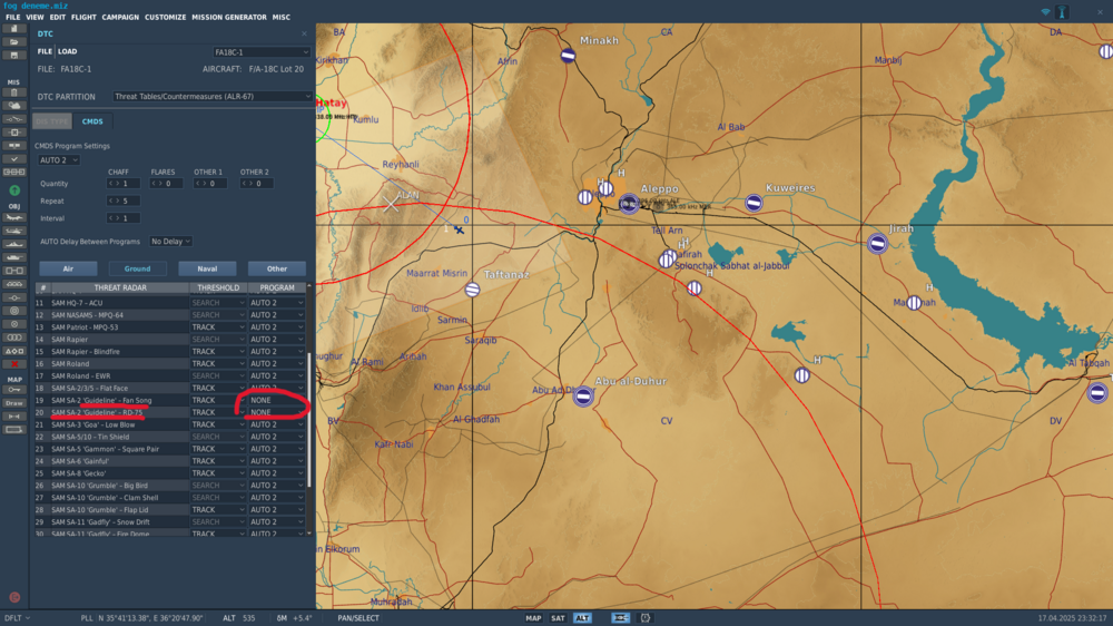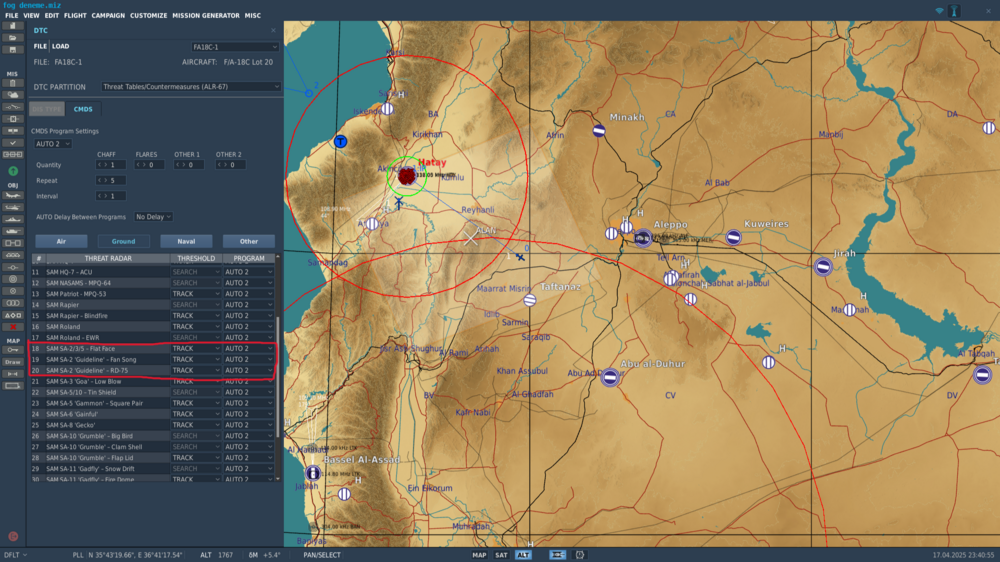 I use cmds as Semi Auto with manual mode 1 selected. so that I can use cmd forward for countering radar guided missiles. System chooses a chaff only auto mode for me. cmd aft would be manual 1 -flare only long duration programme- which can be used against manpads threat while diving or egressing. And with this setup, I can also stop a started programme by pushing cmd forward. that is my setup. Now, after last dtc update, I tried to defend a SA2. S/A mode ignored my dtc setup and started to drop 2 chaff 2 flare probably 0.5 interval. none of Auto modes had flare inside them.It should have been 1 chaff 1 interval 5 repeat. after that, I chose none for SA2 threats, it still dropped chaff flare. My dtc was loaded as default when I started in the air. guard channels were enabled for checking whether dtc loaded or not. I also tried without a dtc, and with dtc auto selected, didn't make any difference. There is one more thing that I want to mention. It used to show which manual mode selected on right of the S/A. But not anymore. I don't know whether intended or not. none.trk auto2 1 chaff 5 rep 1 int .trk
