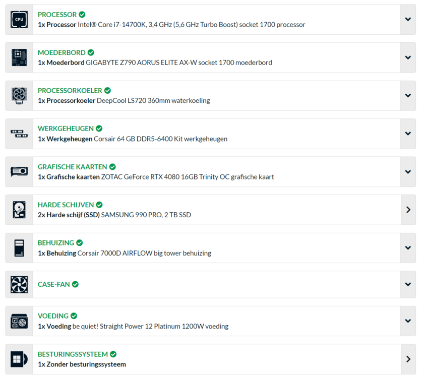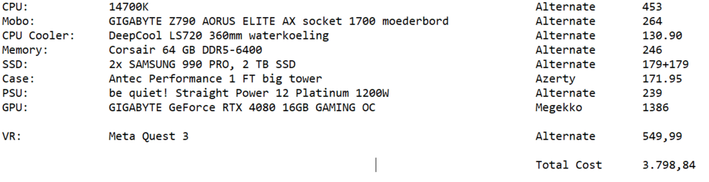 The 4090 is currently +-650 Euro's more, I would rather hold out with a 4080. Current build setup I saved now = 3978 Euro's or 4148,94 US Dollars. Still need to wait 2 months before receiving my bonus, but I'm excited allready! With my current GTX1080, i7 4790K, 16GB DDR and Samsung Odyssey Plus this is a massive improvement. Racing sims I can manage with 60hz ( tweaked graphics ), and DCS 60hz with reprojection enabled (30Hz) With the Meta Quest 3 iam more then happy to cap it at 72Hz. -