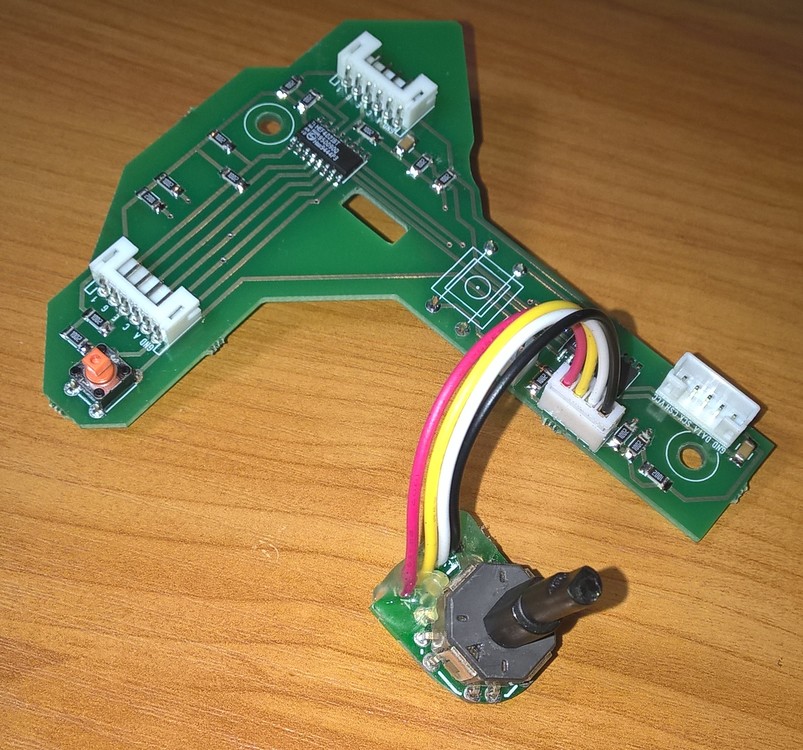 Here is the layout file made in Sprint Layout format. It includes the main board, two boards for the top hat switches and another one for the thumbstick hat switch. ALPS 8-way RKJXL switches are used for the hats with fore-aft-up-down-top press directions wired. 8 additional diodes on the circular boards are needed if you want to wire one of the top switches (or both) to work as a traditional hat (to register up-left, up-right, down-left and double-right movements). Shift registers are CD4021 in SOIC package, all the resistors are 10 kOhm, capacitors are 0.1 mF, connectors are JST PH (2 mm pitch). All passive SMD components are in 1206 packages. Thumbstick hat board needs to be trimmed a bit as well as the grip halves to fit properly; it can be done with a small file. Top hat switches will be mounted on the top cover separately from the main board as they have to be as close to the hat caps as possible to provide realistic travel. I'll provide the pictures as soon as the hats are mounted (hopefully next weekend). SuncomF15_V2.zip -