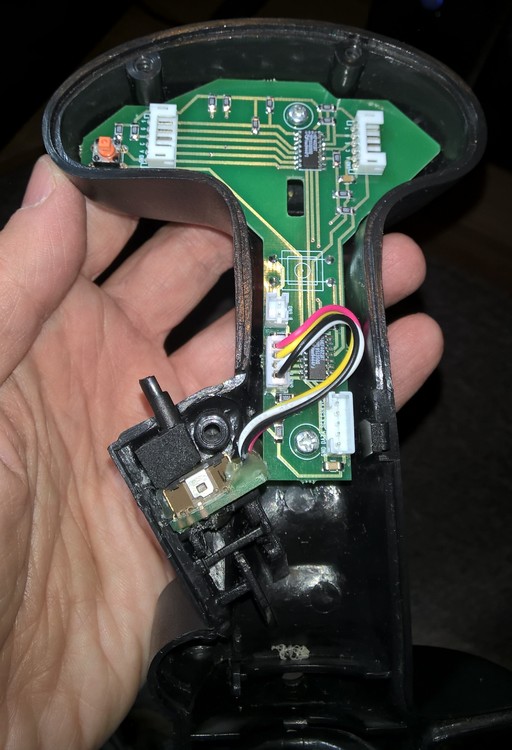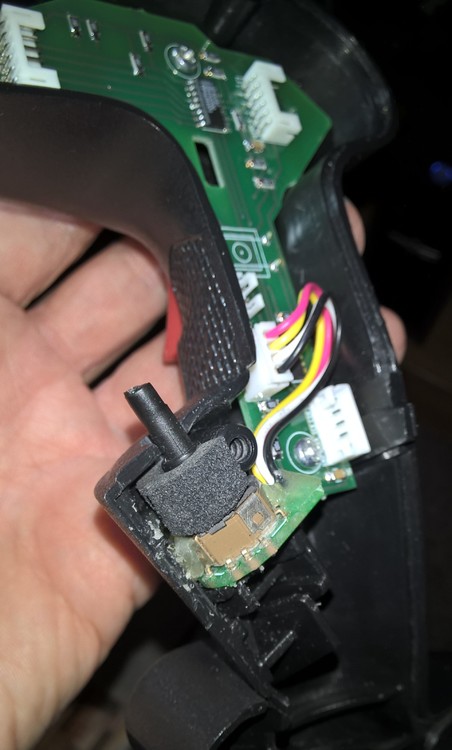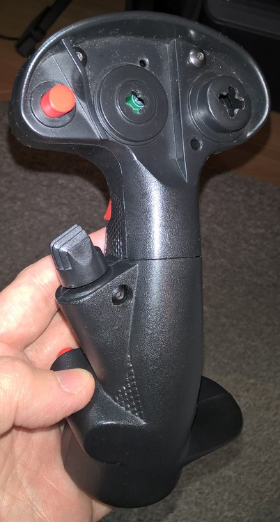 I've finally got some update on Talon grip mod. The main board (2x CD4021 shift registers) was assembled as well as the thumbsick 3-way hat board (ALPS 4-way switch wired to register fore-aft and down movements only). Then I've mounted the thumbstick using some hot-melt glue. The original Suncom thumbstick shaft is made of a very good plastic which is unlikely to crack so I've just shortened it and made a 2 mm hole to press-fit it on ALPS shaft. I've also used a small file to extend the holes in the grip body halves to restrict the thumbstick shaft movement to fore-aft directions only. As it turned out with a relatively long shaft the hat movement is a bit "light", so I've made a kind of gasket out of a piece of rubber foam and placed it around the shaft to add some resistance. Here is the result so far; the top hats will follow.