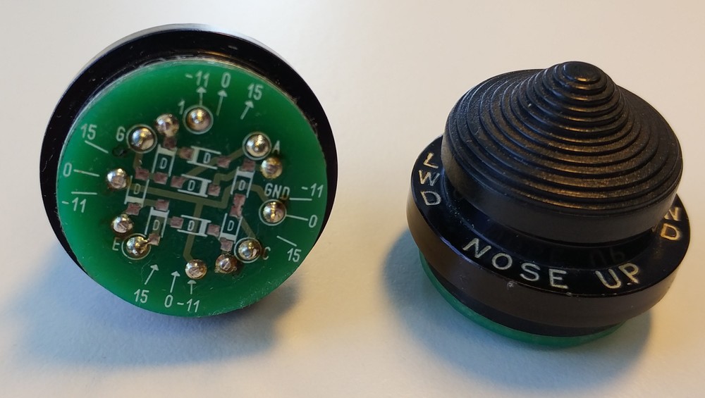 Schmirco, very good work! Just a reminder in case you want to use the "Press" function of the hats (ALPS RKJXM): the center switch operates both when the shaft is pressed and when it's moved to any direction. You'll need to add a small additional PCB (21x18 mm) to each of the hats to allow the independent operation of the center switch- please see the posts #354 and #356 of this thread. Please also see the PCB layout in Sprint format attached. Debolestis, after a long delay I'm finalizing the grip (actually, two grips) assembly :); here are the pics of the right-side hat using ALPS RKJXL switch and a modified body of a real-life OTTO hat switch (US military surplus bought on eBay). Hat cap and shaft are Suncom stock parts (the shaft was shortened and drilled to fit the switch shaft). The "15" and "-11" marks are used to set the correct orientation of the hats- in the real grip they are rotated 15 and -11 degrees. The left-side hat pics and the whole upper part assembly pics will follow soon. Center Switch PCB 21x18.zip -