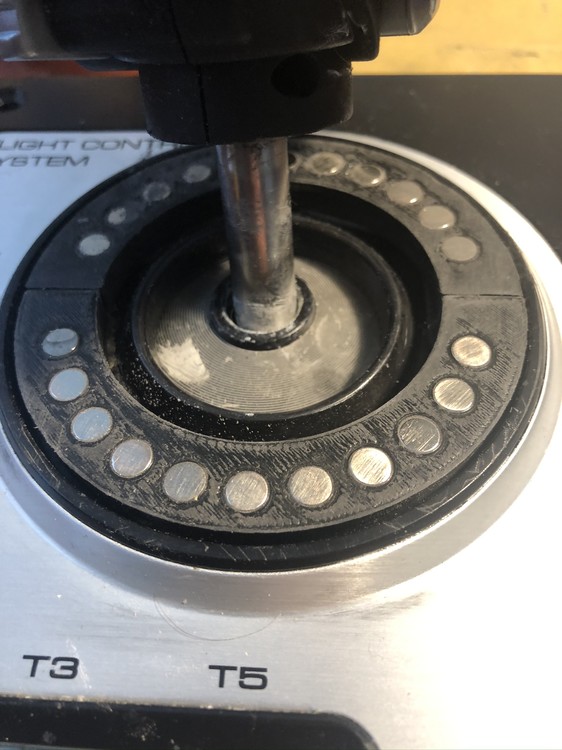 Hi all, I own a Saitek x52 and enjoy flying helicopters in DCS but I was was getting frustrated with the design of the joystick. The spring design made it challenging and I wanted to have the joystick mostly mimic the feel of a real helicopter's joystick where the joystick didn't force back to center. So I made a mod that works very well for me and wanted to share it with the community. The idea is to remove the spring and replace it with a set of magnets on the base and a metal plate "attached" to the joystick post. Here is a picture of the magnet base (this is a representation of the finished magnet ring but shows the set of magnets used): Here is the joystick with the metal plate installed: As you can see it is a destructive mod - I needed to remove the spring and the plastic guide. Unfortunately, the design of the joystick doesn't make it easy to remove the spring and guide so I had to cut them out. Here is a video of me using the joystick flying he Huey: Not the greatest video but you get the idea. The motion is like glass and constant pressure across the entire range of motion. There is not a centering feature but neither is there in a real helicopter either (at least the helicopters I worked on while in the Army: CH-47, OH-58 and UH-1). Since this is my only joystick, I use it for all of the other fixed wing aircraft and it works well for me. Maybe one day I'll add some kind of centering detent. If you're interested in more detail please PM me. I have 3D printed the parts (except for the metal plate) and can easily replicate it if needed. Thanks, Rick