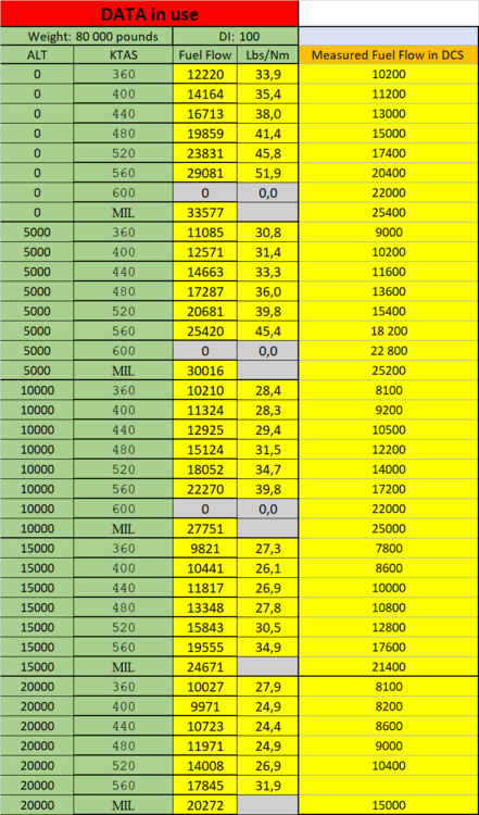 So, here is the @crazyduncwork : https://github.com/crazydunc/F-15E-Strike-Eagle-Performance-Calculator/releases/tag/1.0.0.9 In the attached file there is my XLS. My xls is less precise than his .exe because I am far less experimented, I haven't yet integrated the pylons, and some conditional DIs like those of the 610 gal fuel tank but perhaps more transparent in understanding how it operates. The source of the work is a file F-15E-Flight-Manual-15-April-1993.pdf that can be found on Google (I'm not sure if I'm allowed to share it here). The fuel flow tables were taken from page 704 and the subsequent pages of this PDF. The DIs table was made from pages 625 and the following ones. As an exemple this loadout give a weight of ~80 000 lbs and a DI of 100: Since the gross weight is 80,000, pages 722-723 should be used, and on this page, the column corresponding to a DI of 100. This give : Do you observe the same flow rates? Is the documentary method correct? I hope my explanations are clear. fuel_consumption.xlsx