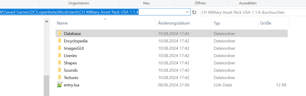 The AssetPack Zip contains the folder structure Mods/tech, so make sure you don't end up with a path like this: "DCS/Mods/tech/AssetPack/Mods/tech/..." -