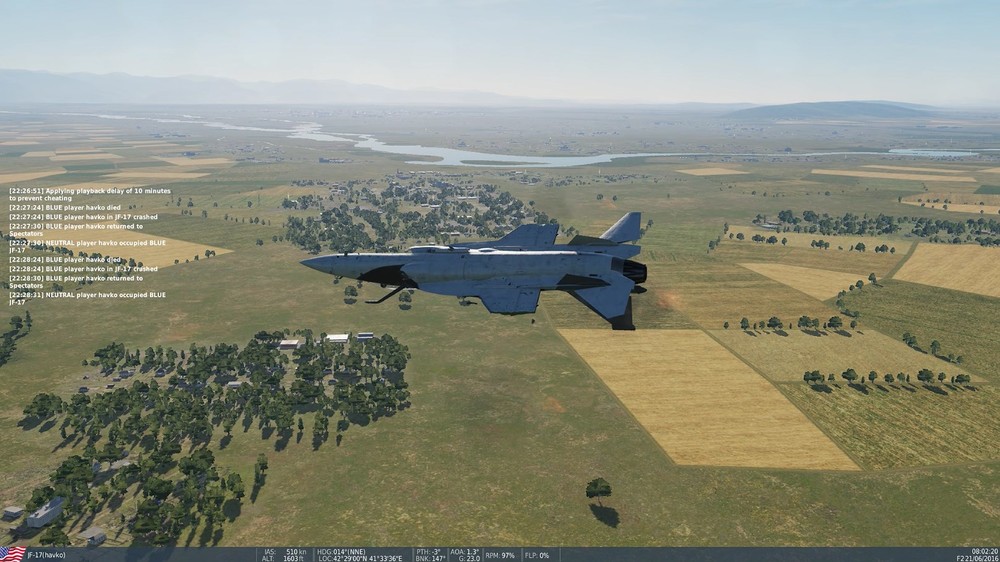 Description: You will rip your wings off if apply pitch, roll and rudder movment simultaneously at 500-550 knots at ~1000 feet. Also, it is possible that this bug is related to wing ripping off when you're pulling hard while in wake turbulence, that's usuall in dogfight Steps To Reproduce: Climb to 300-1000 feet ASL Get 500-550 knots Start pulling up, after 0.5-1s when you get 7-8G's, make a hard roll left or right with rudder applied in the same direction. You will probably break your wing. DCS version: latets open beta. 2.5.6.47404 Track, log, tacview and DxDiag can be found in attached .rar Addition: Seems like the problem is that roll and rudder movment creating a huge over-g. In the video below, you can see that wing are breaking with 20-23 G's. Video: JF-17 Wing Ripping Bug.rar