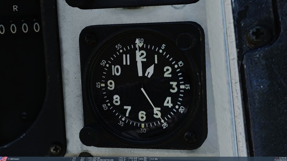 Both the clock and the stopwatch in Tomcat cockpit run slow. Approximately 6 seconds for every 10 minutes - 35 seconds for every hour. Same in pilot and RIO pit. Mission on the screenshot started at 12:00:00, screenshot taken an hour of gametime later.