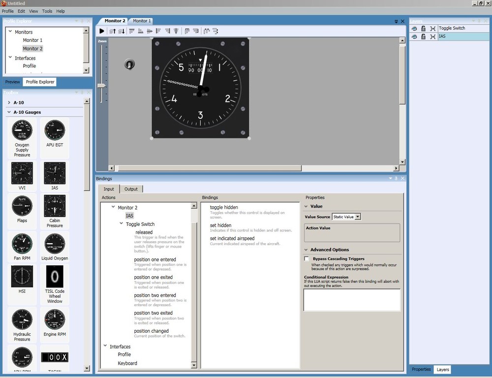 Helios Triggers and Bindings Helios working great for me on DCS 1.5XX and Windows 7. I'm trying to add a dummy button in my cockpit, that when click will allow another panel to become visible. This works great for my right and left consoles etc but I need another. Easy to place the panel and a dummy button but how to trigger the visibility of the hidden panel with click of the button on the dummy panel Where is the Triggers list? What are you actually dragging? Dont see Airspeed changed. Where is the binding point? Are these the interfaces referenced below? https://github.com/Gadroc/helios/tree/master/Helios/Interfaces Do I need to use this, to accomplish what I want to do? Answer NO dont need these just add interface to profile from the Profile menu item...Add Interface. Could anyone expand on use of triggers and bindings! As seen in image below my only interfaces are Profile and Keyboard, should something else be displayed here? http://drive.google.com/open?id=0BxbF0egbrdnHT09TZ2R5MHp4dkU Any help greatly appreciated. :)