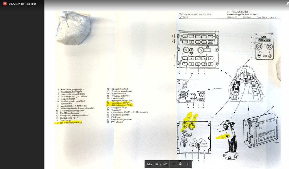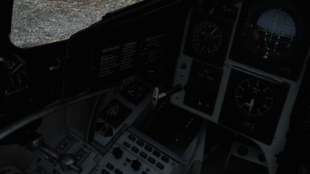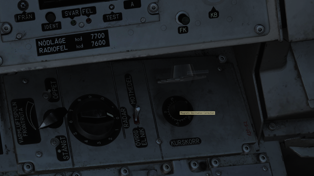 The INTERCOM button click functionality is broken in general. Radios are interchanged. To communicate via intercom, you have to actually click on the screw that is labeled "TRÅD". The Viggen manual (from this thread) describes this on page 231 as "omkopplare TRÅD" which translates to "switch wire" - i guess its either some kind of circuit breaker or used for maintenance. Maybe a native speaker can help out here. When clicking that TRÅD screw, the button labeled SM (described as "SM-omkopplare FR 24" in the linked Viggen manual on page 231, apparently the intercom/FR24 button) to the right is animated being pressed down (also bugged, parts of the button go through the panel surface having the panel clip through the button. See attached image). When having the intercom button bound to a HOTAS button or using a keyboard bind, the incockpit SM button stays in depressed position regardless if the button was released. When clicking the TRÅD screw, this does not happen. FR-22 and FR-24 are interchanged in the controls. The above linked RL Viggen manual states the left console intercom (SM) button as FR-24. The button on the stick (number 15 on the page 231) is described as "SM-omkopplare FR-22. In the DCS controls, the SM button is called FR-22, the stick button FR-24. Viggen Intercom button bug.trk