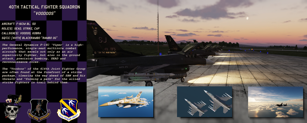 [414th][Casual-milsim][Beginner-friendly][All platforms][All regions] The 414th Joint Fighter Group is a beginner-friendly organization for those that are looking to fly with others online with no-extra frills or fine print attached and no mandatory attendance required. We are open to all pilots, no matter their location in the world, gender, or age. Our mission is to provide for the organization, training, operation, and deployment of effective and mission capable airframes and aircrews to the strike fighter squadrons we host. Most of our pilots are in the US, with a couple located in EU. Flights are typically around 1700 PST through 2000 PST on the weekdays and 1600 PST through 2300 PST on the weekends. We hold our training sessions every Sunday, sometimes we opt for a session of our Liberation campaign. Our operations are held on a monthly basis and are designed to be challenging environments that test your thinking and capabilities as a pilot. As a Group, we are home to different squadrons that have focus in a specific airframe, such as our squadron specializing in the F-16C, the 40th Tactical Fighter Squadron “Voodoos”. We currently have openings for the following squadrons: 40th Tactical Fighter Squadron “Voodoos”: F-16C and JF-17 414th Tactical Fighter Squadron “Phantom Eagles”: F-15C and F-15E (upcoming) 414th Naval Operations Squadron: F/A-18C and F-14B We welcome pilots and backseaters of all skill levels and platforms and are willing to teach those newer to DCS the in's and out's of their respective aircraft! We also welcome those who are seeking growth and leadership opportunities within our group. If you are not much of a DCS pilot, there are also other ways you can support us whether you enjoy making missions, creating liveries for our aircraft, or assuming AWACS/GCI/C2 responsibilities in our operations. Our discord: https://discord.gg/aafaxHr If you're looking for a group to fly with, learn from, or just simply have a good time with, please feel free check us out through the discord linked above! See you in the skies!