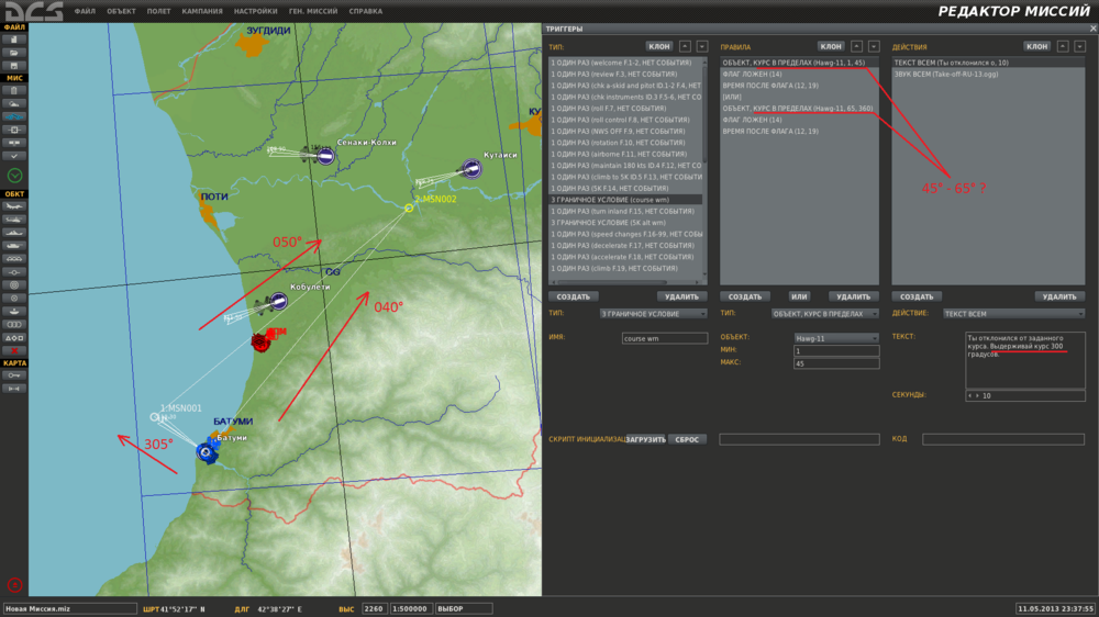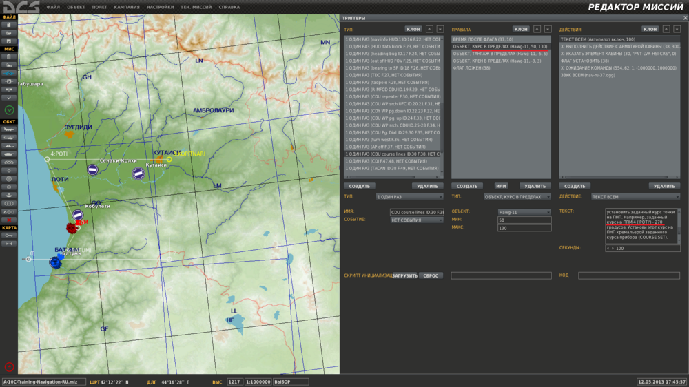 Поправил миссию "Навигация". Была аналогичная проблема с курсами в триггерах (см. скриншот). (файл извлекать в папку "DCS World\Mods\aircrafts\A-10C\Missions\RU\Training\Aircraft Operation\3") A-10C-Training-Navigation-RU.rar