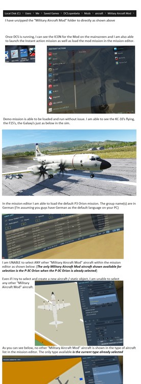Unable to Choose / Select MOD aircraft in Mission Editor @BlackLibrary and everyone! First off I want to thank you all who made this mod possible, there are so many good things about it that I look forward to. My problem as posted above is that I am absolutely UNABLE to load any "Military Aircraft Mod" aircraft into the mission editor. This does not matter if it is a static object or an AI aircraft, nothing shows up in the list (other than what is already preloaded in the default P-3C Orion quick start mission. Please take a look at my following screenshot attachment. Thanks for any and all help! :helpsmilie: -