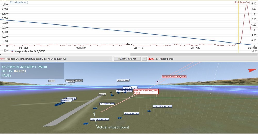 Really interesting - I hadn't noticed that final turn. What are the aerodynamics of the missiles like - is that last-second turn enough to make the difference between hitting and missing? Because that sounds suspiciously like a negative-value bug. Edit: Yes, it does signficantly change the path of the bomb - I plotted using tacview and you can see the estimated target position change: