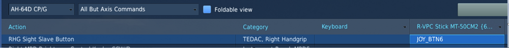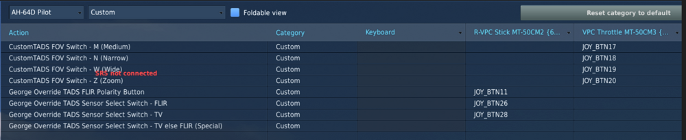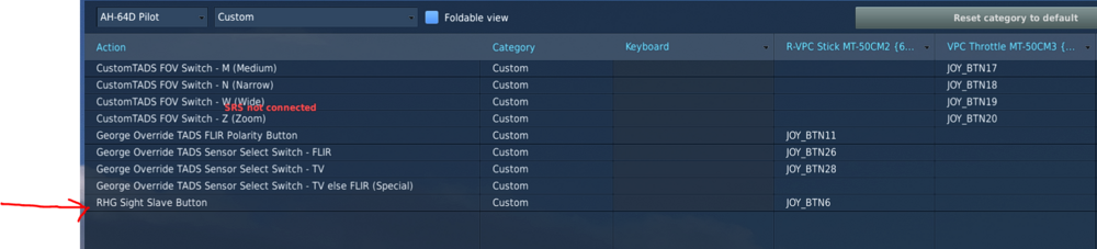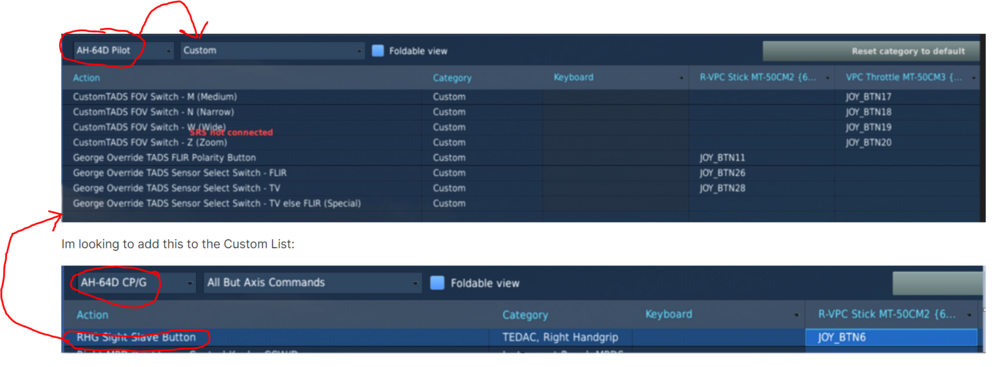 @LeCuvier MANY THANKS! You led me down the path I needed. I now have that command option in the Pilots "Custom" menu to bind. I had to modify the end of that string so it would be inserted in the "Custom" menu. I know that button is not in the Pilots seat, neither are the other ones in the Custom menu. That is the whole point of the Custom menu, so that you can use them when you dont have a Human front seater with you and you dont want the fuss of switching seats while in flight when George is up there. Thanks again! {down = tedac_commands.RHG_SIGHT_SLAVE_BTN, up = tedac_commands.RHG_SIGHT_SLAVE_BTN, cockpit_device_id = devices.TEDAC_INPUT, value_down = 1.0, value_up = 0.0, name = _('RHG Sight Slave Button'), category = {('Custom')}},