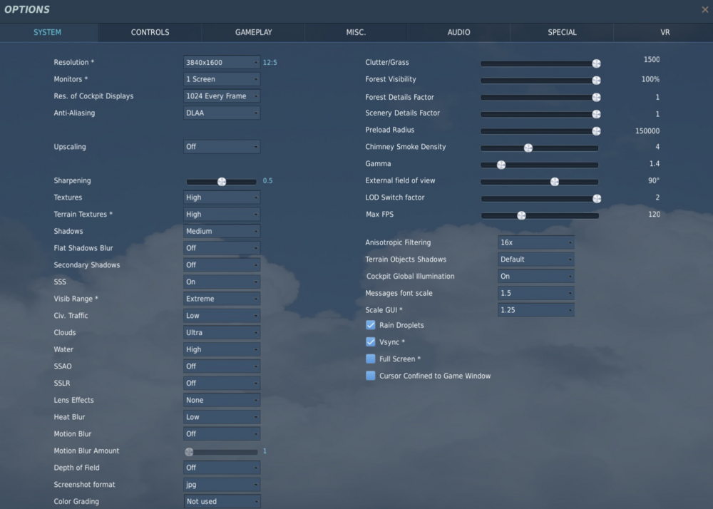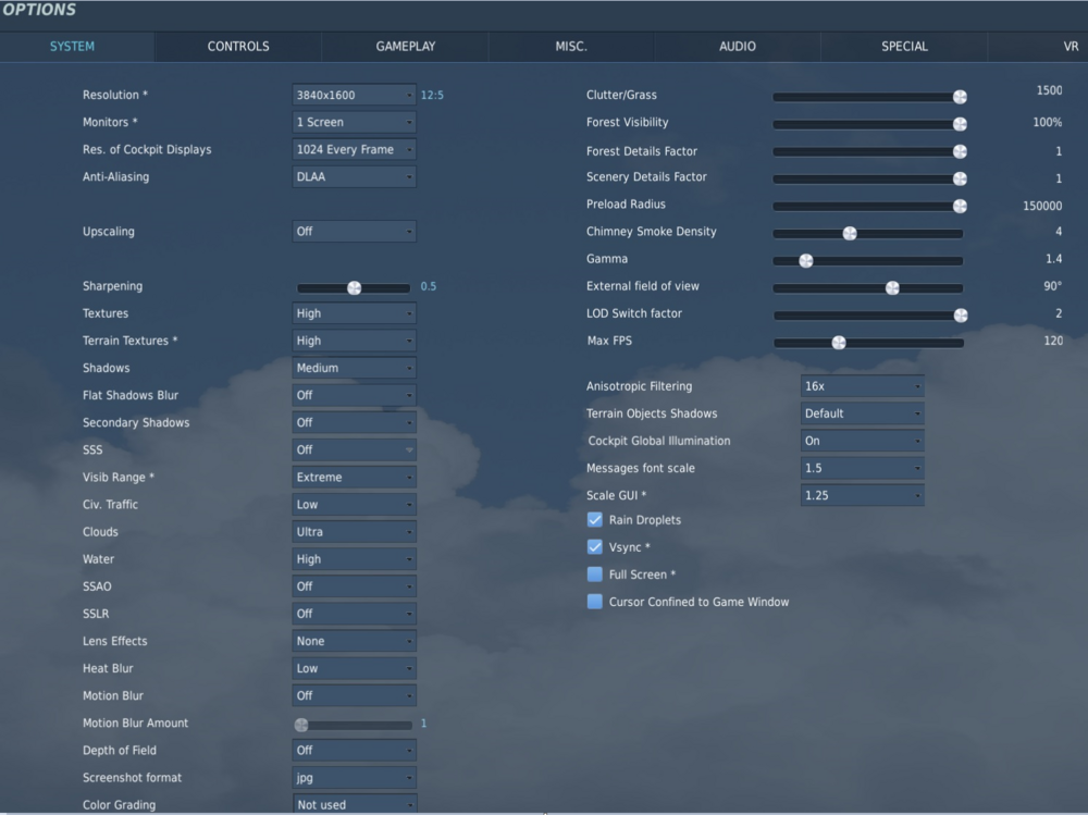 2 graphics issues I have that I havnt been able to figure out. -Tree shadows (for example) flicker when Im flying helicopter. -When I fly in formation with another Viper, and their NAV lights are on, flying level seems to be ok, but when they pull up, I see streaks of their external lighting? I have my frame rates locked at 120 FPS, and my monitor is set to 120 Hz, VSync is on. Attached is my current Graphics settings. Which settings impact the 2 specific issues mentioned please? Thanks for any help