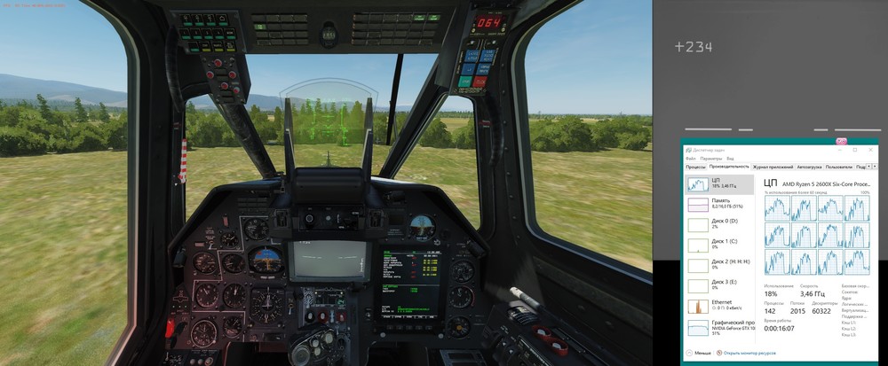 Зеркала выключены. Как такое можно обьяснить? О_о Вроде норм, но вот в DCS как-то спорно он себя показывапет. Если со старым процем игра, в кабине, стабильно держала 55-60 ФПС, то теперь идут "пики" 50-55-60-73 ФПС. При этом на внешних видах, было стабильно 55-60, сейчас 30-40. Сейчас "разогнал" до 3464. По крайней мере биос показывает эту частоту. Не подскажешь как выяснить истинную частоту ОЗУ? Вроде бы да, HyperX Predator [HX436C17PB3K2/16], по идее c XMP-профилем она может и 3600 MHz держать. Но пока не пробовал. Понял, спасибо. Буду стараться по максимум тогда разогнать ОЗУ. На материнке, MSI B450-A PRO, в биосе есть функция авторазгона, когда ее включал частота процессора выставлялась 4,05 МГц, в винде было около 3,9 МГц. При этом процессорный кулер очень шумел, думаю использовался на 100%. DEEPCOOL Neptwin WH Могут ли подобные странности - неравномерная нагрузка процессора и видеокарты, быть вызваны тем что я использую 3 монитора одновременно?