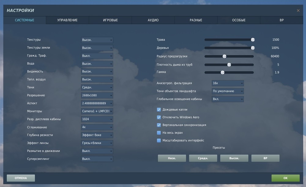 При множителе 4.0 ОС загружается, и все работает хорошо. Прогнал систему этими тестами по 3 раза - без проблем, ничего не крашилось, и без бсодов. Касательно "плясок" вокруг DCS, форматнул SSD где столяла игра, снова установил туда игру. Удалил папки "metashaders" and "fxo", далее восстановил клиент. Поигрался с настройками, в итоге все выставил на "Высокие". Супермеплинг, Размытие в дивжении, Градж. трафик - оставил выключенными. Запустил миссию "баталия" - на таких настройках не супер-плавно, но средне-играбельно. В игре, в кабине 45-60ФПС, снаружи 35-45-60 фпс. т.е. график фпс скачет вверх-вниз. Буду искать способы "стабилизировать" ФПС хотя бы до 50-60 во всех сценах. Собсна, нашел темы с описанием настроек и на, что, из аппаратного обеспечения, они влияют: https://forums.eagle.ru/showthread.php?t=201196 https://forums.eagle.ru/showthread.php?t=201600 https://forums.eagle.ru/showthread.php?t=202092 https://forums.eagle.ru/showthread.php?t=200906 https://forums.eagle.ru/showthread.php?t=201196