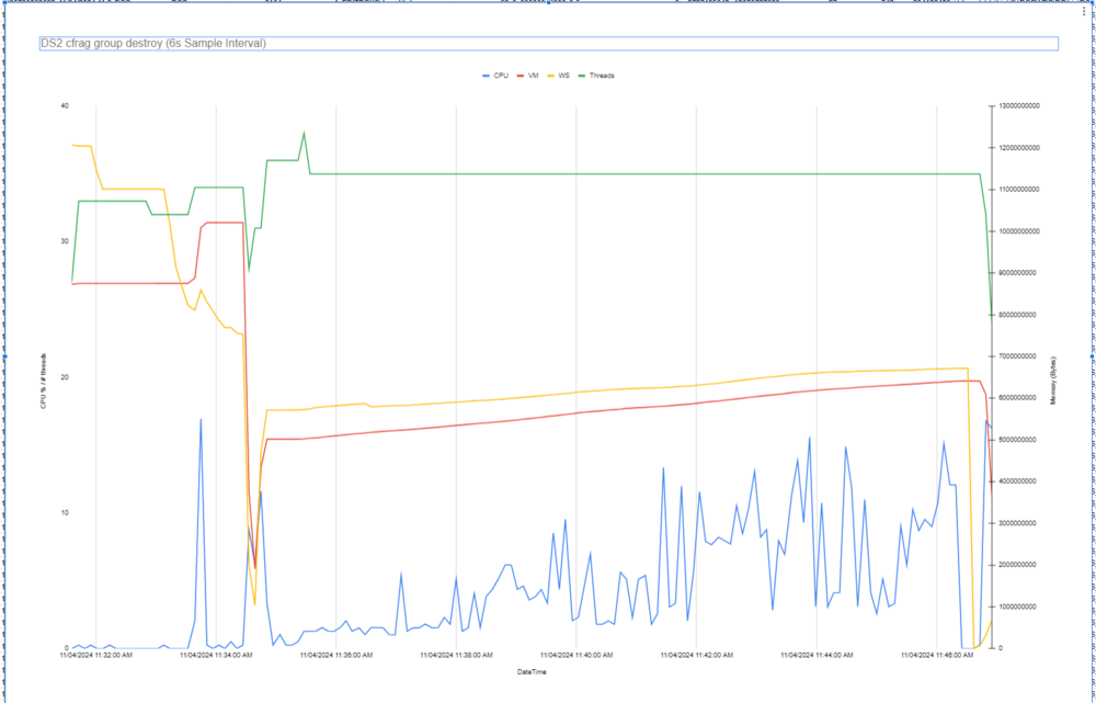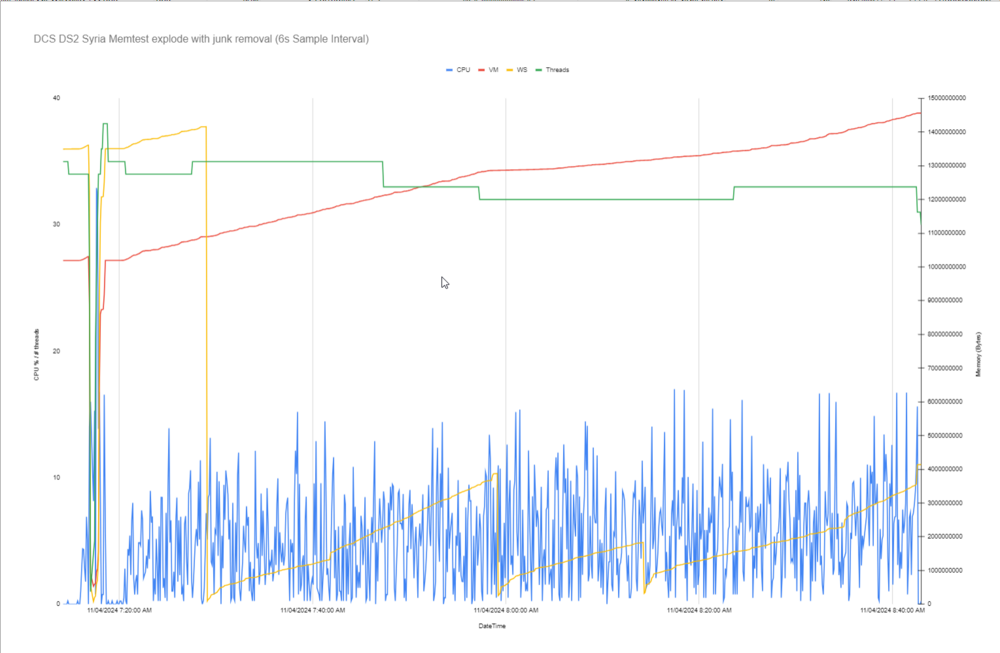 TL;DR: when a mission spawns or clones a unit, memory is allocated. This memory is never deallocated, even on group/unit destroy, explode or removeJunk. Thus over time any mission that creates units will crash either from memory starvation or from hitting the RegMapStorage cap of 4094 groups. This investigation started after we noticed the excellent Pretense mission was dying after a few hours on our hosted server. By profiling the memory usage of the DCS_Server process using Process Lasso logging, we noticed that the VM (private bytes memory) continued to increase regardless of unit destruction, client join/leave or any other factor. The control was performed with a basic ME mission with a single client helo and no AI. VM usage was flat. The logical next step was then to write a script that spawned new units at a constant rate, and destroyed them on a cadence. If VM was deallocated, we would expect to see a sawtooth pattern. If it wasn't, we would expect to see a relatively straight incline up. The mission starts with 2 minutes of no spawning to establish a baseline with all scripts loaded. It is virtually flat. Once spawning starts (1 group of 5 vehicles every 3 seconds), VM rises steadily and does not reduce with destroy() being called on all ground objects every 60 seconds. When the spawn rate was increased to 1 group of 10 units every second, as expected the rate of VM accrual increased and VM was never deallocated. With a mission (not server) restart, no (effective) deallocation was performed as the VM restarts higher than when the mission was restarted. The next step was to also removeJunk around the spawn Zone to clean up as much as is permitted in the scripting environment. The same spawn parameters were used, with an additional step of calling removeJunk on a sphere 2x the size of the spawn zone every 5 minutes. In this test, VM continued the trend of accruing with no reduction due to destroy() or removeJunk(). It continued to accrue VM until the server crashed with the following error: 2024-04-11 03:15:28.743 WARNING EDOBJECTS (Main): RegMapStorage start cycle to find empty space in <viColumn> 2024-04-11 03:15:28.743 ERROR EDOBJECTS (Main): RegMapStorage has no more IDs (4094 max) in <viColumn> 2024-04-11 03:15:28.743 ERROR EDOBJECTS (Main): Failed assert `false` at Projects\edObjects\Source\Registry\RegMapStorage.cpp:124 This effectively caps the life of any mission that creates units on the fly based on the server RAM and the RegMapStorage cap of 4094. At 1 group per second being created, we'd expect to hit this cap at ~4094 seconds, or about 1.1 hours. This is basically exactly what we saw, despite all units in those groups being both destroyed and junk removed. A working theory is that this behaviour was introduced with the Apache FCR in order to allow destroyed vehicles to still be seen by the FCR. That said, others have said anecdotally that this predates the Apache. The effect is that dynamic missions require a regular server (not mission) restart to prevent this VM saturation, on a cadence that depends on the rate at which new units are spawned by the mission, and the total server RAM. Request that ED advise or investigate a solution that allows mission editors to purge the VM allocation of "dead but still there objects" in areas that are no longer relevant to the mission to prolong the life of the mission/server. While this may have other effects e.g. rendering them invisible to FCR, the alternative (a server crash or restart) is surely not better. Log data and charts: https://docs.google.com/spreadsheets/d/1p0tKoeipHJOaChhKnzNKjLD30maU3xKCvJH5o4quBY0/edit?usp=sharing (edit: if anyone wants to help me replace the MOOSE functions with stock to eliminate that potential source of error, please do!) edit2 another data point using trigger.action.explosion rather than destroy(). Same issue. RnR_Memtest_Syria.miz update: tested a different miz with no MOOSE (thanks cfrag), which creates 7 groups per second and destroys the group rather than the individual vehicles. Same VM accrual, and right on cue at ~590 sec (4094 / 7) it starts spamming RegMapStorage full.