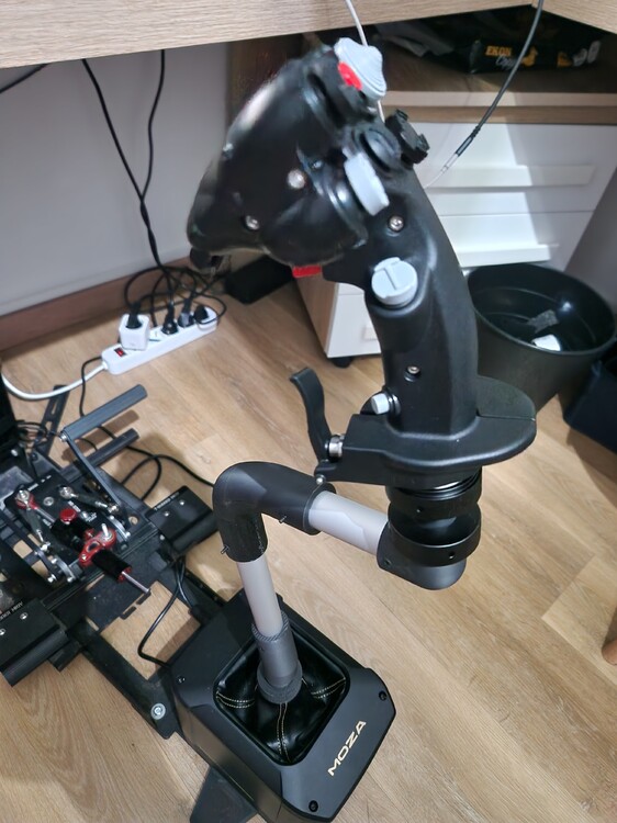 Thanx, From the base, floor, to the top of the stand, before the Moza adapter, it measures 57 cm. From the base to the base of the handle, including the adapter, it measures 63.5 cm. To use it, I reduced the Moza's axes to 60% to avoid leg problems.