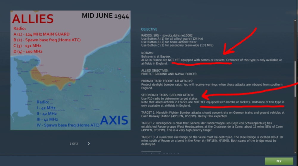1. The explanation of what weapons are available is provided in the briefings. You will find this under NOTAMS OR just above the description of the air-to-ground taskings for that mission. See the image below as an example. 2. DCS does not provide spawn-position information when the F10 map icons are off (which is the case on SoW). However, you will get used to the airfield layouts and spawn locations, just as everyone else has. Your compass in the cockpit, the position of the sun and the windsocks can help you work out where you are on the airfield. Part of what it means to fly on Storm of War is to learn these kinds of things (airfield layouts, runway orientations, major landmarks etc). It's all part of the intended learning process that comes with flying on the server. It is true that this is not necessarily the easiest option for newer players, but this is an accepted design principle with SoW. 3. Do NOT use the load-out pre-sets from the drop-down menu. Click on each pylon on the aircraft to check was is available, and what is loaded on. -