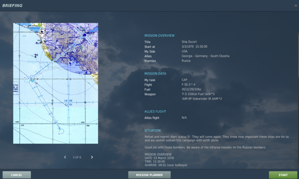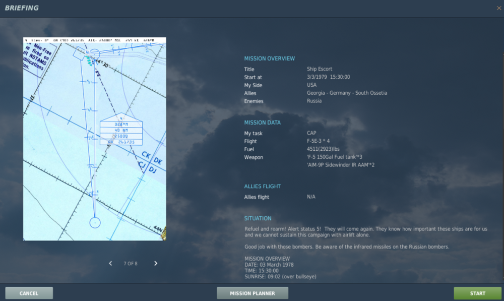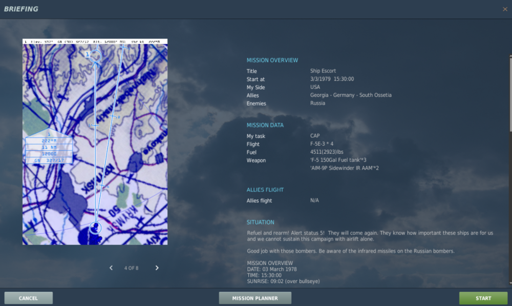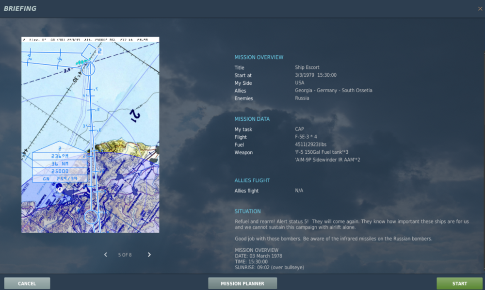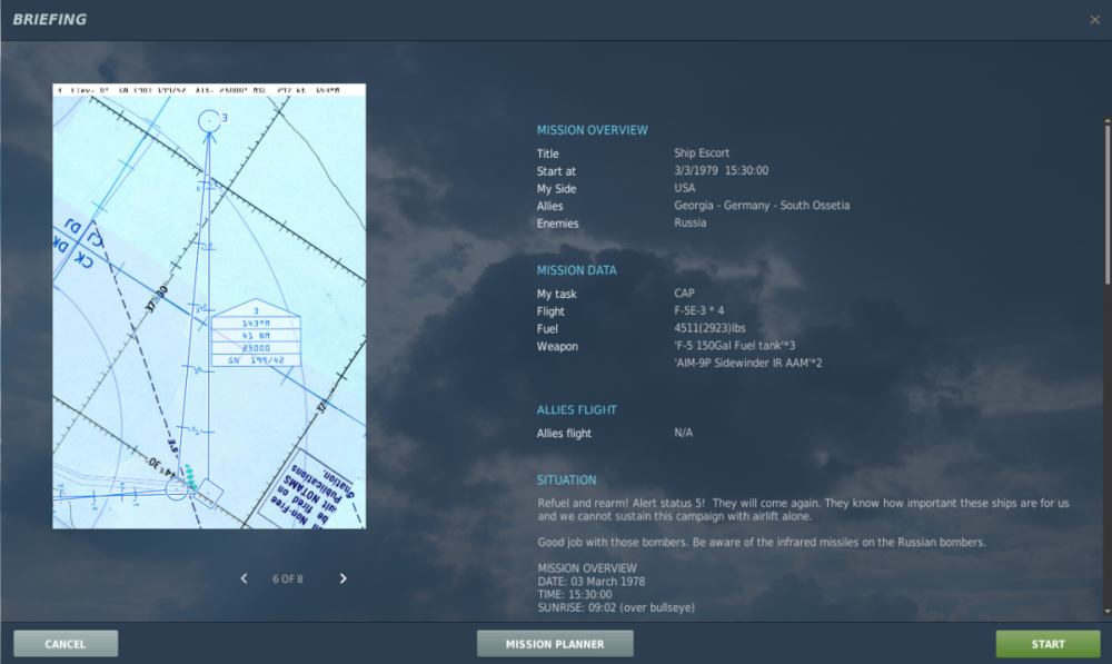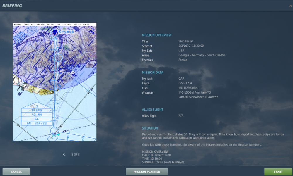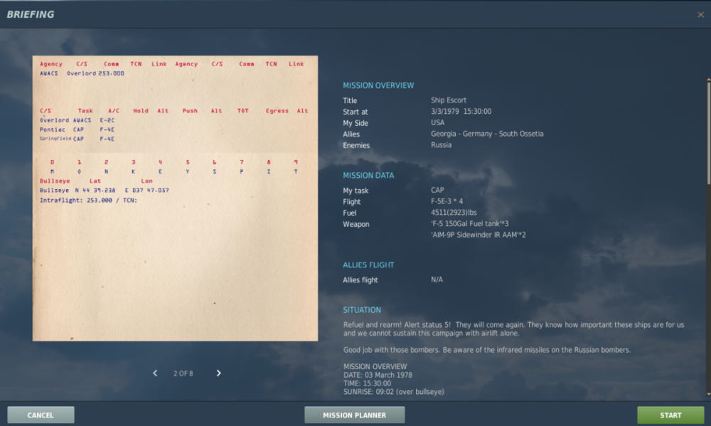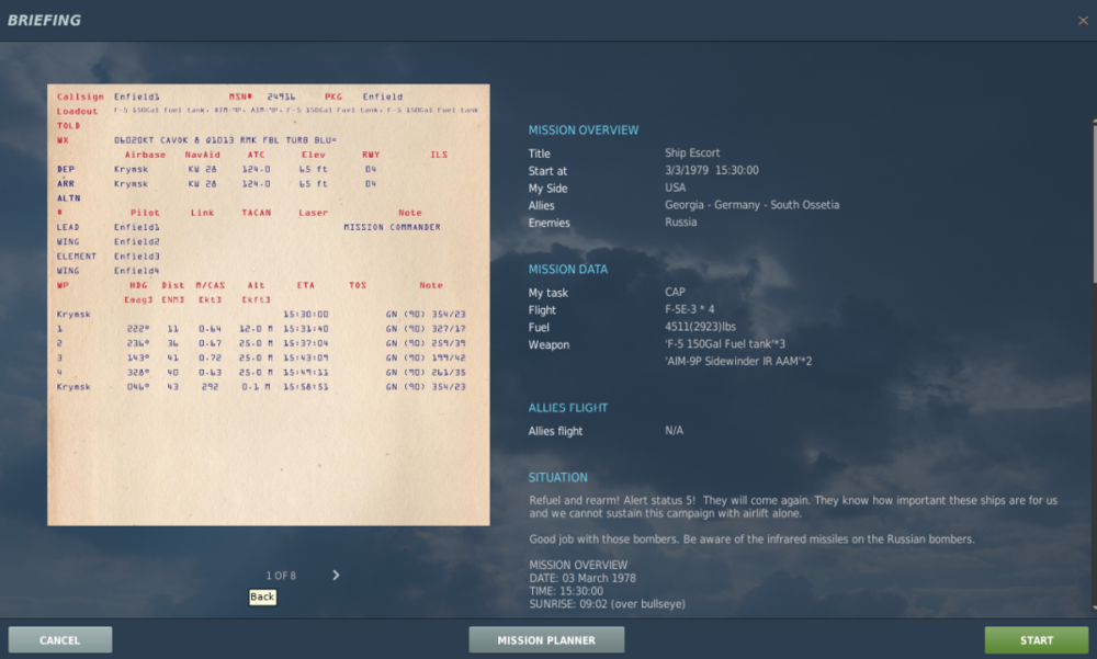 I'm disappointed by this campaignd0ppler replied to d0ppler's topic in F-5E Black Sea Resolve '79 Campaign This is the documentation. Same as the kneeboard. I fly the route (with full burner), shoot down the MiGs till AWACS says sky is clear, then land. Mission not suceeded, no info or any clue what's gone wrong.