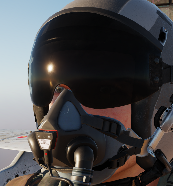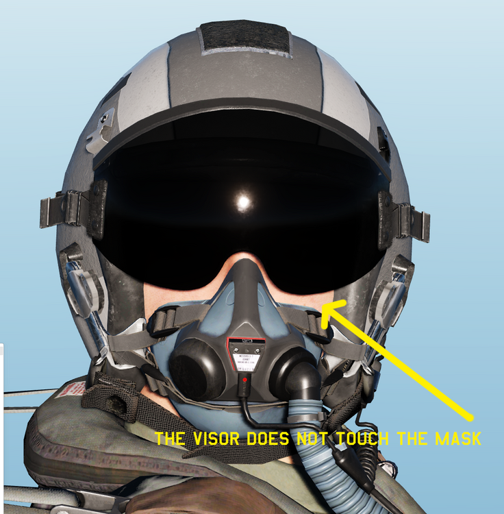 and finally regarding the visor and the oxygen mask, contrasting dozens of photos on the hgu-68P and the mbu-20 oxygen mask: - The mask should be closer to the pilot's face so the nose piece touches the forehead. - The visor should be lowered all the way, so it would touch the mask as it really is. Thanks @BIGNEWY for the support. Greetings -