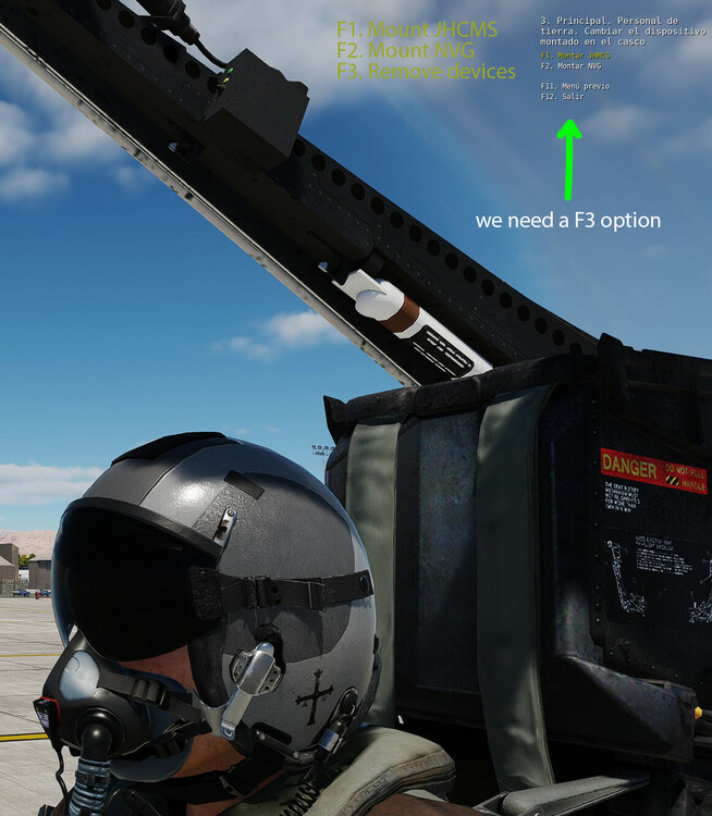 9. more issues found: The visor up/down animation is broken, the visor doesn't move but the pilot's arm and hand do movement. The position of the hand and arm in the animation is separated from the visor in the HGU-68P version of the helmet without the JHCMS, with the JHCMS it is correct. In the DCS menu you can request by radio to the ground crew to change the device between the helmet with the night vision goggles (HGU-68P with banana adapter) and the version with the JHCMS visor but, you can NOT request to remove both (to keep the HGU-68P version simple). I hope it helps Greetings