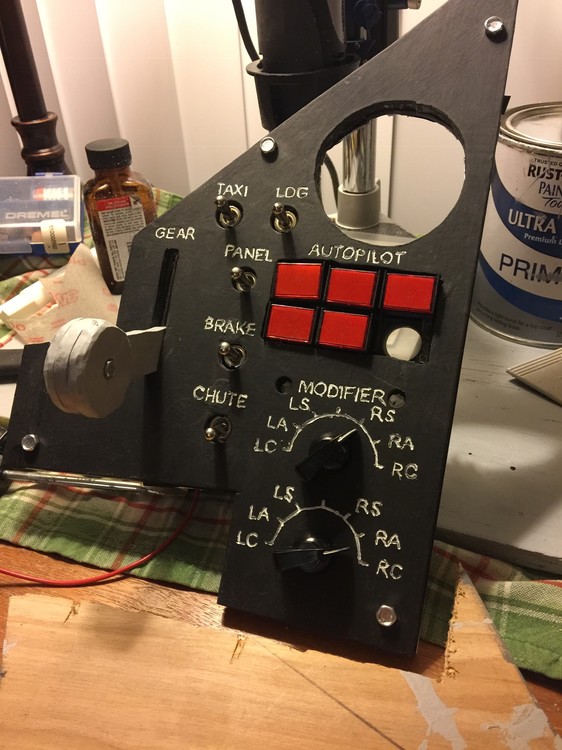 My method, does not use laser engraving: 1/16” (1.5mm) aluminum (switches mounted on this) + 1/16” (1.5mm) black acrylic/plexiglass (creates a space for switch retaining nuts and LED wires; also extends to the full aluminum sheet size so mounting screws are recessed below engraved layer) + 1/4” (6mm) clear acrylic/plexiglass painted with 3 layers ‘brushed on’ flat black acrylic, with lettering and lines manually engraved with a dremel + 2mm round bit. Dremel is mounted in a press. The corners are cut off 9/16” (not shown in the pics) to allow the mounting screws a recess. As a guide for engraving, I print a sheet of the labels I need, with 1/2” (12.5mm) space between words, to allow a border for the rubber cement to hold it on place. The dremel bit pretty well mangles the paper label. I do one label at a time, so I can remove and wash off the cement...rubber cement takes a long time to set, and it can be easily rubbed off. (1/16” + 1/4” = 5/16”, which will fit the switch column flush with the face of the panel) It’s definitely not comparable to laser engraving, but then I’m willing to trade finesse for the $400-$500 for an engraver I’ll only use for cockpit panels.