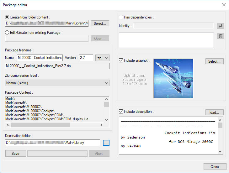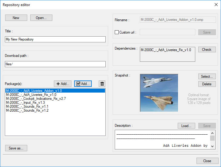 One word about dependencies... You probably seen (but not tested) that Open Mod Manager support dependency mechanism for the packages. This mechanism equally work for downloads. This mean that, if a package to be downloaded have some declared dependencies, the software will seek (recursively) within all remotes packages (of the current target Location) for dependency packages to download and will automatically add it to download stack. This mechanism allow repository creators (and packages creators) to create "dummy packages" that does not embed nor install anything but have only a list of dependencies. By requesting to download such package, the software will automatically download all dependencies packages (this will work for installation too). This can be used for example for people who want to provide a single package easy to spot, to download, name it "The Big Package Compilation Of My Squadron" that will download all packages defined as dependecies at once. How to define dependencies ? You have to create a package (either empty or not) and adding dependencies, checking the "Has dependencies" checkbox. The dependencies values are other package's "identity". You can read the "Identity" of a package in the package details dialog (right click on package, View details). This is simply the raw package filename without the file extension. For example, suppose a package filename My_super_Package_v2.3.zip, its Identity will be My_super_Package_v2.3 this is as simple as that... Notice that since version string is part of the filename, the identity of a package depend on its version (in cas its version is defined)... Notice also that all is case sensitive.
