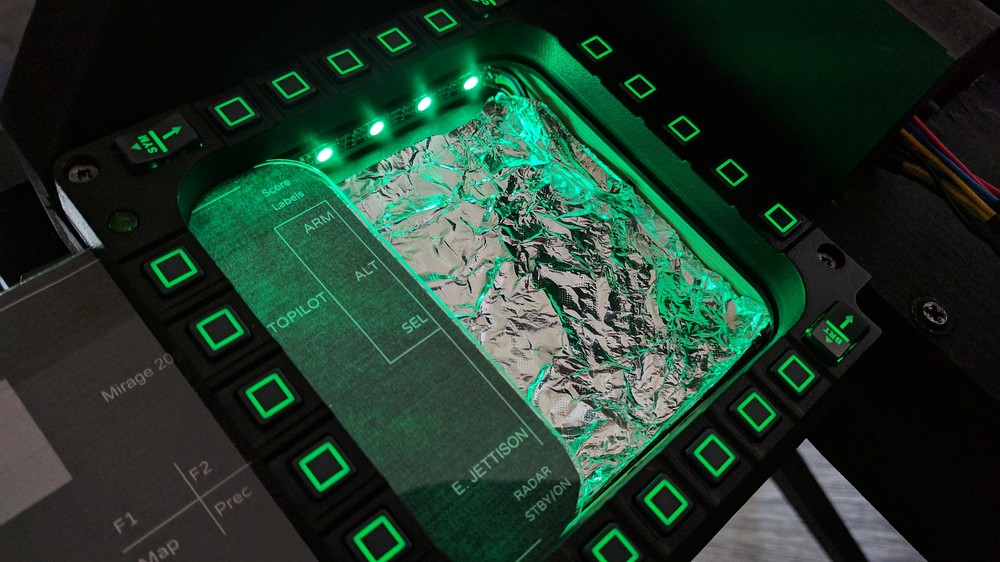 Last night I put som LED's behind the MFD's. They light upp the cards printed on regular paper with my crappy laser printer. I will print new cards at work on a better printer.