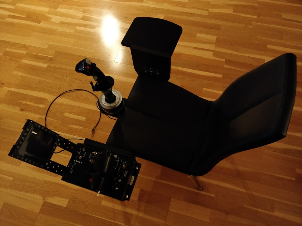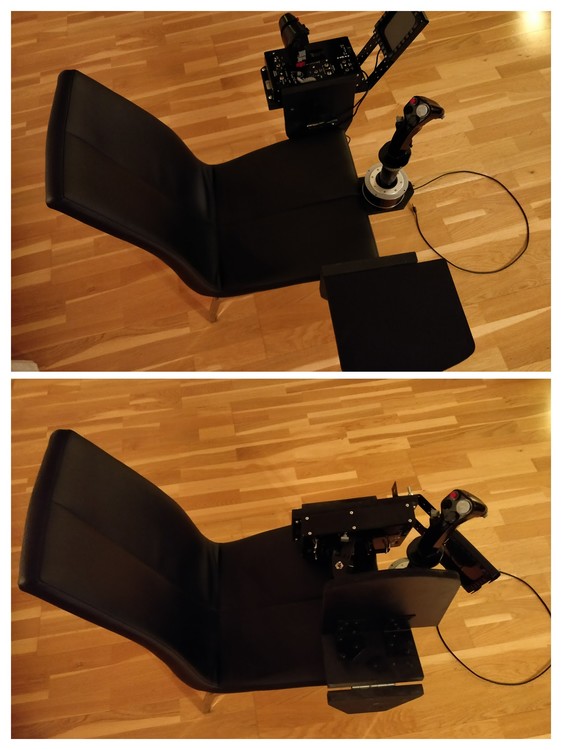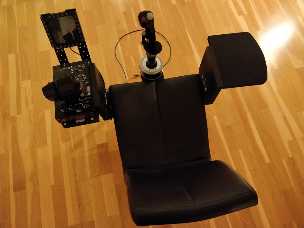 Compact seat made of a dining chair with legs cut off to make it lower. Throttle and mousepad can be folded for easy storage. Only one MFD but with pinkyswitch held in (modifier in DCS) I can press the buttons on the other MFD. May mount the other MFD on the mousepad. Under the seat is a USB-hub = just one cable to the computer :thumbup: When in VR i can look at the throttle or stick in DCS and it's in the right position and easy to find.