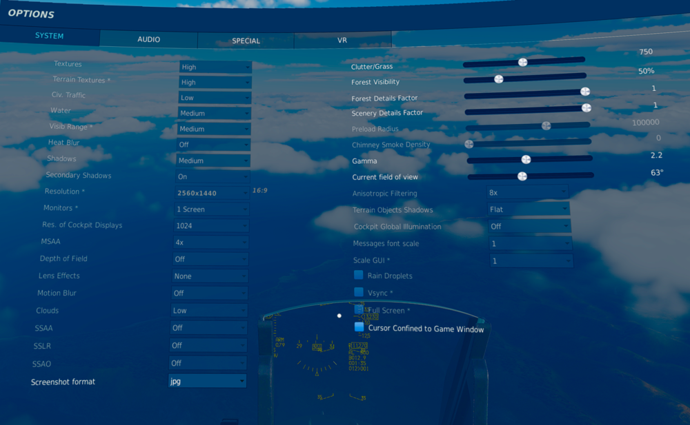 Is there a setting or combination of setting in DCS that would produce a clear sharp display? I don't care if the FPS is 1 or in anyway flyable. I would just like to look over the canopy rail once and see solid concrete instead of what looks like oatmeal that has been raked by a Japanese gardener. I have a 11600KF running 6 cores at 5.2GHz and the 6900XT regularly bounces up to 2.4GHZ. 32G of RAM and a G2 headset. I'm always stuck at 45FPS even though I turn all the setting to low or off.