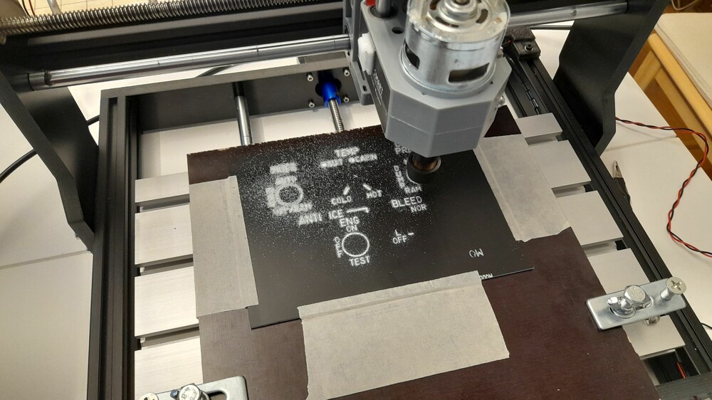 Neues vom FA-18 Simpit Eine kleine 3018 pro CNC Gravier-/Fräse hat heute nach einem kurzen Testlauf die erste Blende hergestellt.