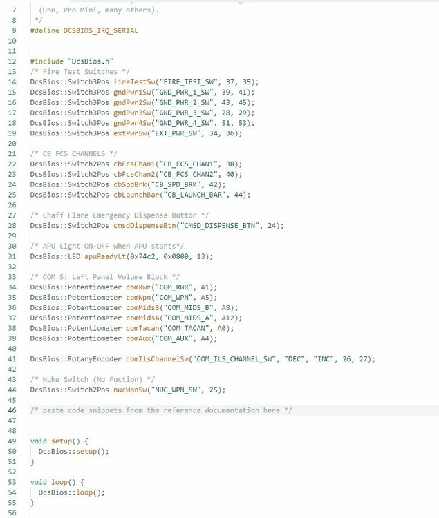 Jau, mit dem Magnetschalter werde ich vermutlich noch Probleme bekommen. Ich hab bisher halt überhaupt keinen Schimmer von Arduino Boards. Aktuell liegen hier 4 Elegoo Mega2560 Boards. Der Magnetschalter soll für die APU genutzt werden. Befeuert wird der Schalter mit einem 24V Netzteil. Schaltvorgang mit Hilfe von DCS-Bios über ein Mega2560 und ein Relais Modul. Hilft es wenn ich das Board für die Schalter auf der linken Panele in die Front lege oder sollte ich hier abgeschirmte Kabel verwenden? Ich hab von DCS-Bios momentan noch Null Ahnung. Arduino Software und der DCS Bios Hub sind installiert. Das angeschlossene Mega2560 wird erkannt ....und dann ist auch schon Ende bei mir