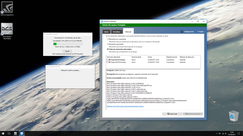 Bueno, después de casi un més fuera de DCS, he decidido volver y al instalar el mapa de Nevada el antivirus ha detectado lo siguiente: Se trata de dos troyanos, catalogados como muy peligrosos. Xadupi..... Troyano Suweezy...Troyano Es la primera vez que me ocurre, nunca me había pasado con las versiones anteriores. No puedo asegurar que esté relacionado con DCS, lo que si puedo asegurar es que esto ocurre durante el proceso de instalación de DCS. Podría tratarse de un falso positivo, pero no estoy seguro.
