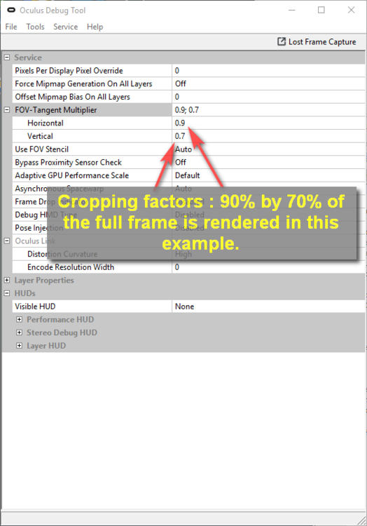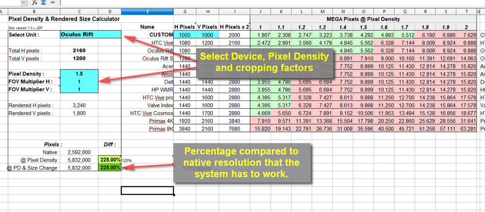 Hi all ! I though I'd share this as it makes a real improvement in FPS. Of course nothing is really free in life, and for this one you pay with smaller image size. Some may find it appalling some may tolerate it. It's still an option and for some systems missing just a couple of frames per second to lock to 45, 90 or whatever your target is, it may be valuable. I also attach a spreadsheet that I used to get an understanding of the impact of Pixel density and image size (as in rendered pixels) on the system. Just remember that shaving off from the edges even a little may make a substantial difference because we are talking "area" so numbers are multiplied... I do not know if other HMDs than the Oculus's have this setting... In Oculus debug tool use the "FOV-Tangent Multiplier" section. In there the two numbers crop the rendered frames by the multiplier specified. (1 means no cropping). Use the attached openoffice calc sheet to see the effects on pixels required by the system for various VR headsets. The blue cells are drop-down lists. Select your device, PD and cropping factor and see the results. The green cells show the percentage of more (or less) work the system has do. The big table makes easier to understand the equivalent settings taking in consideration the characteristics of each device. For example: A PD of 1.5 for the rift makes the system render 5.6 MPixels Same PD on the rift S will require 7.9 MPixels. From the table it is apparent that a PD of 1.2 or 1.3 for the rift S would have (more or less) the same effect (at least on system performance as image quality is also affected by the down-sampling ratio, blur radius used etc etc). Merry Christmas all ! Oculus debug tool : Pixel Density Calculator : PixelDensityCalculator.zip